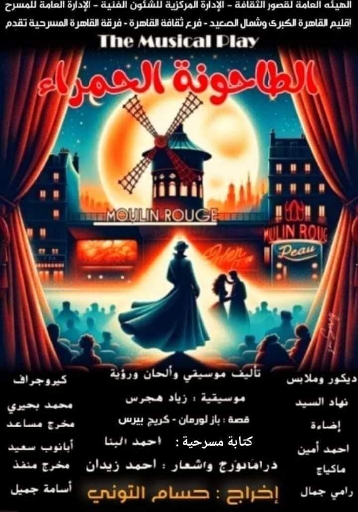 وتقدم فرقة القاهرة في الثامنة مساءً، على مسرح السامر بالعجوزة العرض المسرحي "الطاحونة الحمراء" عن قصة الأسترالي باز لورمان، كتابة مسرحية أحمد حسن البنا، وإخراج حسام التوني.