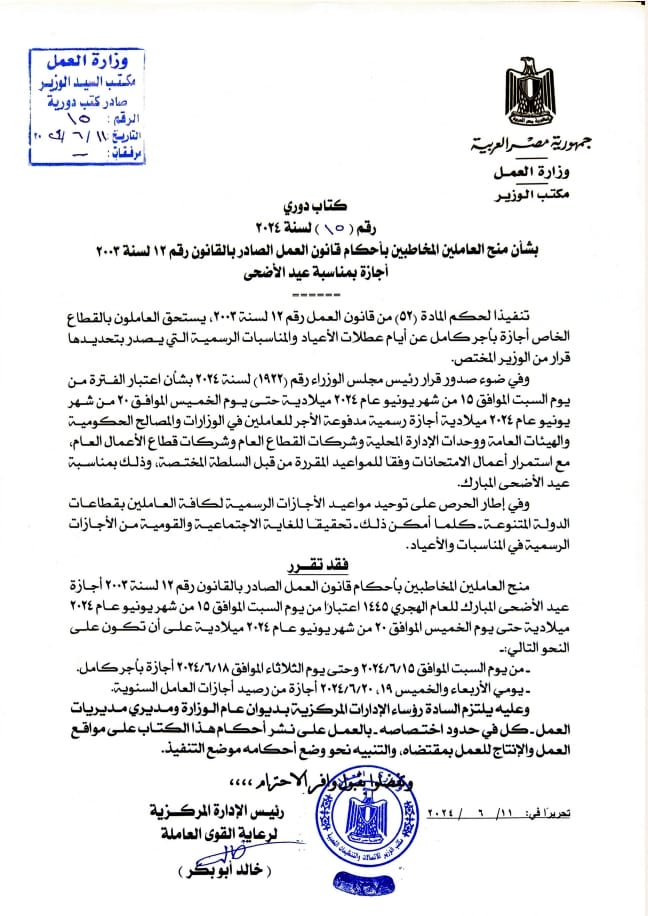 وذلك في ضوء نص قرار رئيس مجلس الوزراء رقم 1922 لسنة 2024 والذي نص في مادته الأولى على أن تكون الفترة من السبت الموافق 15 يونيو حتى الخميس 20 يونيو إجازة رسمية مدفوعة الأجر للعاملين في الوزارات والمصالح الحكومية والهيئات العامة ووحدات الإدارة المحلية وشركات القطاع العام وشركات قطاع الأعمال العام، وذلك بمناسبة عيد الأضحى المبارك.