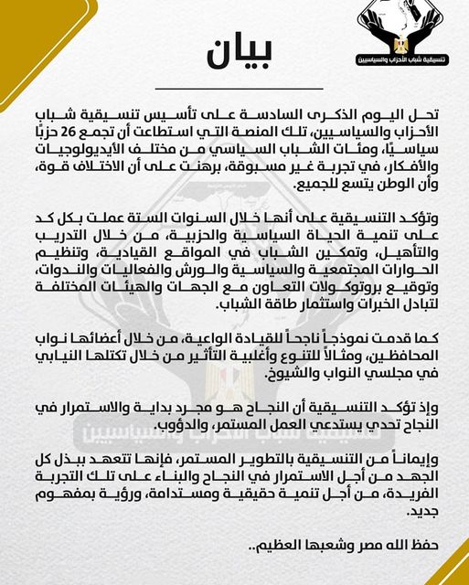 تحل اليوم الذكرى السادسة على تأسيس تنسيقية شباب الأحزاب والسياسيين، تلك المنصة التي استطاعت أن تجمع 26 حزبًا سياسيًا، ومئات الشباب السياسي من مختلف الأيديولوجيات والأفكار، في تجربة غير مسبوقة، برهنت على أن الاختلاف قوة، وأن الوطن يتسع للجميع.