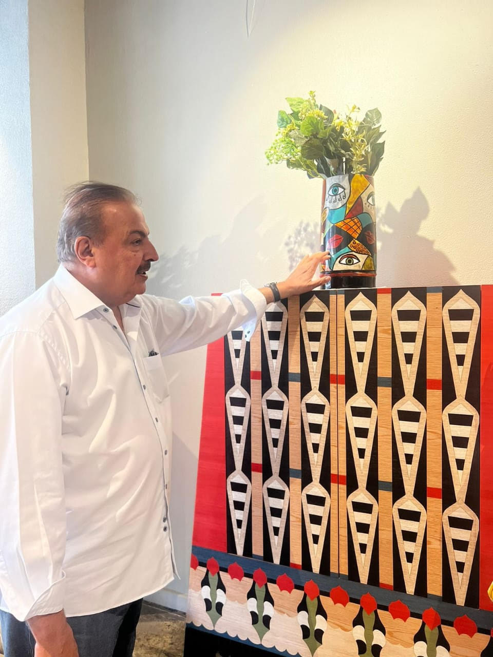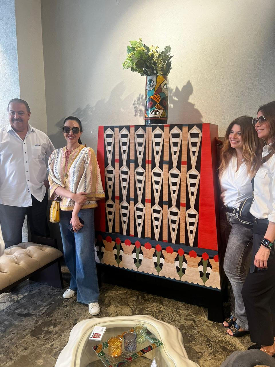 وقام الشيخ راشد بن خليفة برفقة الفنان التشكيلي هادي برعي، بجولة داخل معرض المصممة رانيا فهمي للاطلاع على أحدث القطع الفنية المبتكرة، المصنعة محليًا على يد مصممي فنون الأثاث والحرفيين المصريين.
