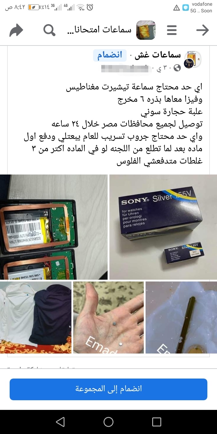 سماعات الغش هى الأخرى كان لها نصيبها فى الاستفادة من مواقع التواصل الاجتماعي الفيس بوك، وذلك لترويج لبضاعتها وتسهيل التواصل مع زبائنها، فقد انتشرت جروبات متخصصة تحمل أسماء لذات المسمى، تعرض سماعات وملحقاتها من حجارة للشحن، بأنواع مختلفة، لبيعها أو تأجيرها مع عرض السعر أو ترك رقم لتواصل أو الاكتفاء بتعليق تم التواصل خاص، فى إشارة لتواصل مع العملاء عن طريق الرسائل الخاصة "ماسينجر"، دور تلك الجروبات التى لا نعلم مصدرها لم يقف عند هذا الحد، بل وصل إلى عرض تسريب الامتحانات وحلها وإرسالها لمن يرغب، وكذا الضم لجروبات مغلقة نظير مبالغ مالية محددة وفقاً لما ينشره البعض على تلك الجروبات.