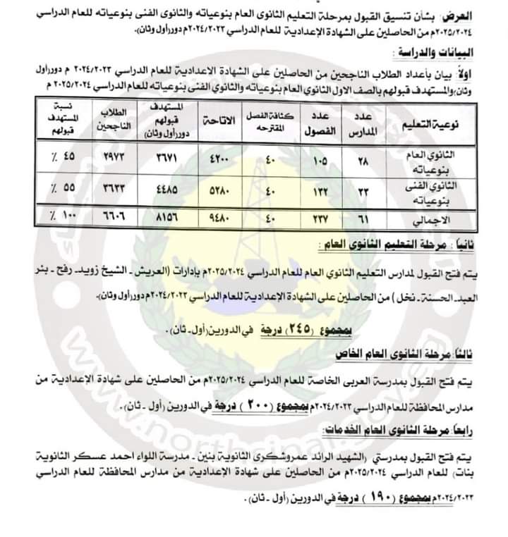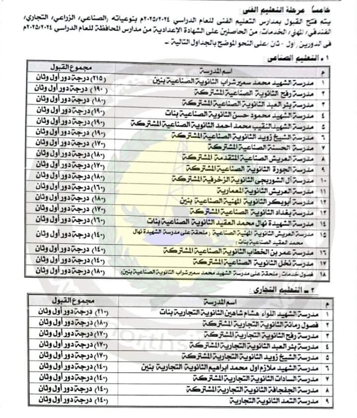 كما لفت المحافظ إلي تحديد درجات القبول بمدارس التعليم الثانوي الفني صناعي – تجارى – فندقي – زراعي(، ففي مدارس التعليم الصناعي تم تحديد مجموع درجات 215 درجة ( دورين أول وثان ) للقبول بمدرسة الشهيد محمد سمير شراب الثانوية الصناعية بنين بالعريش، 190 درجة ( دورين أول وثان ) للقبول في مدارس رفح الثانوية الصناعية المشتركة والشهيد محمود حسن الثانوية الصناعية بنات، الشهيد النقيب محمد احمد الثانوية الصناعية المشتركة، الشيخ زويد الثانوية الصناعية المشتركة، 180 درجة ( دورين أول وثان ) للقبول في مدارس العريش الصناعية المتقدمة و بئر العبد الصناعية المشتركة ومدرسة ال الشوربجي الزخرفية ومدرسة أبو بكر الثانوية المهنية وفصول خدمات ملحقة علي مدرسة الشهيد محمد شراب الصناعية بنين، 170 درجة(دورين اول وثاني)للقبول في مدرسة الحسنة الثانوية الصناعية المشتركة، مدرسة الجورة الثانوية الصناعية المشتركة و مدرسة بغداد الثانوية الصناعية المشتركة، 160 درجة ( دورين أول وثان ) للقبول في مدرسة العريش الثانوية المعمارية الصناعية، الشهيدة نهال محمد العقيد الثانوية الصناعية بنات، 140 درجة ( دورين أول وثان ) للقبول في مدرسة العريش الثانوية المهنية الصناعية بنات، مدرسة عمر بن الخطاب الثانوية الصناعية المشتركة، مدرسة نخل الثانوية الصناعية المشتركة.