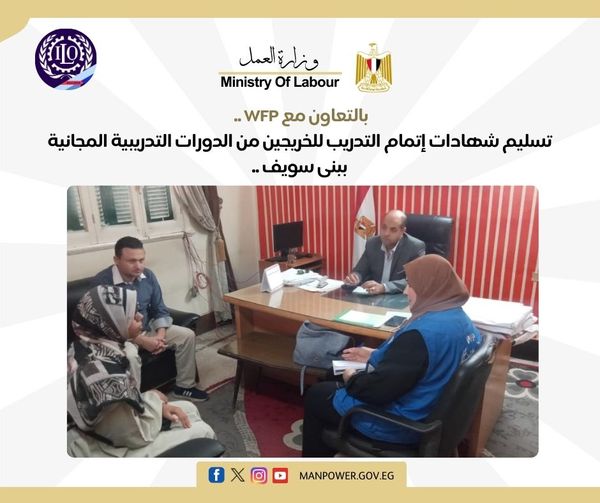وزارة العمل تسلم شهادات إتمام التدريب للخريجين من الدورات التدريبية ببنى سويف