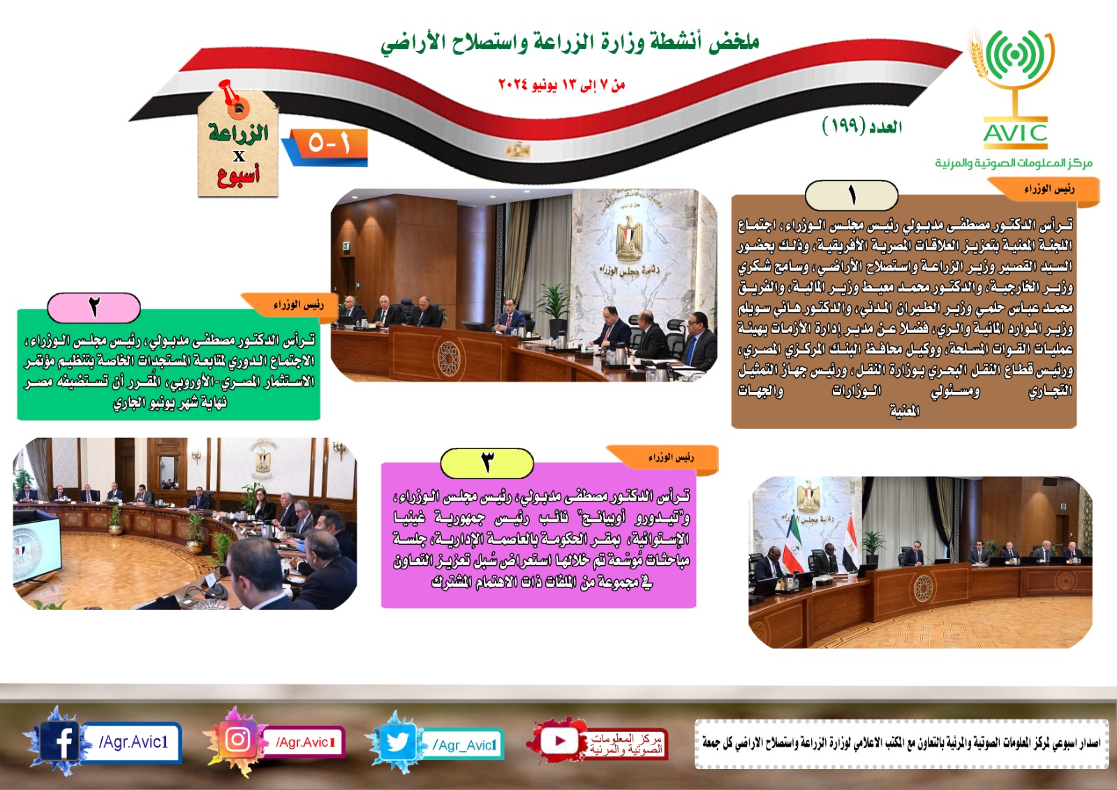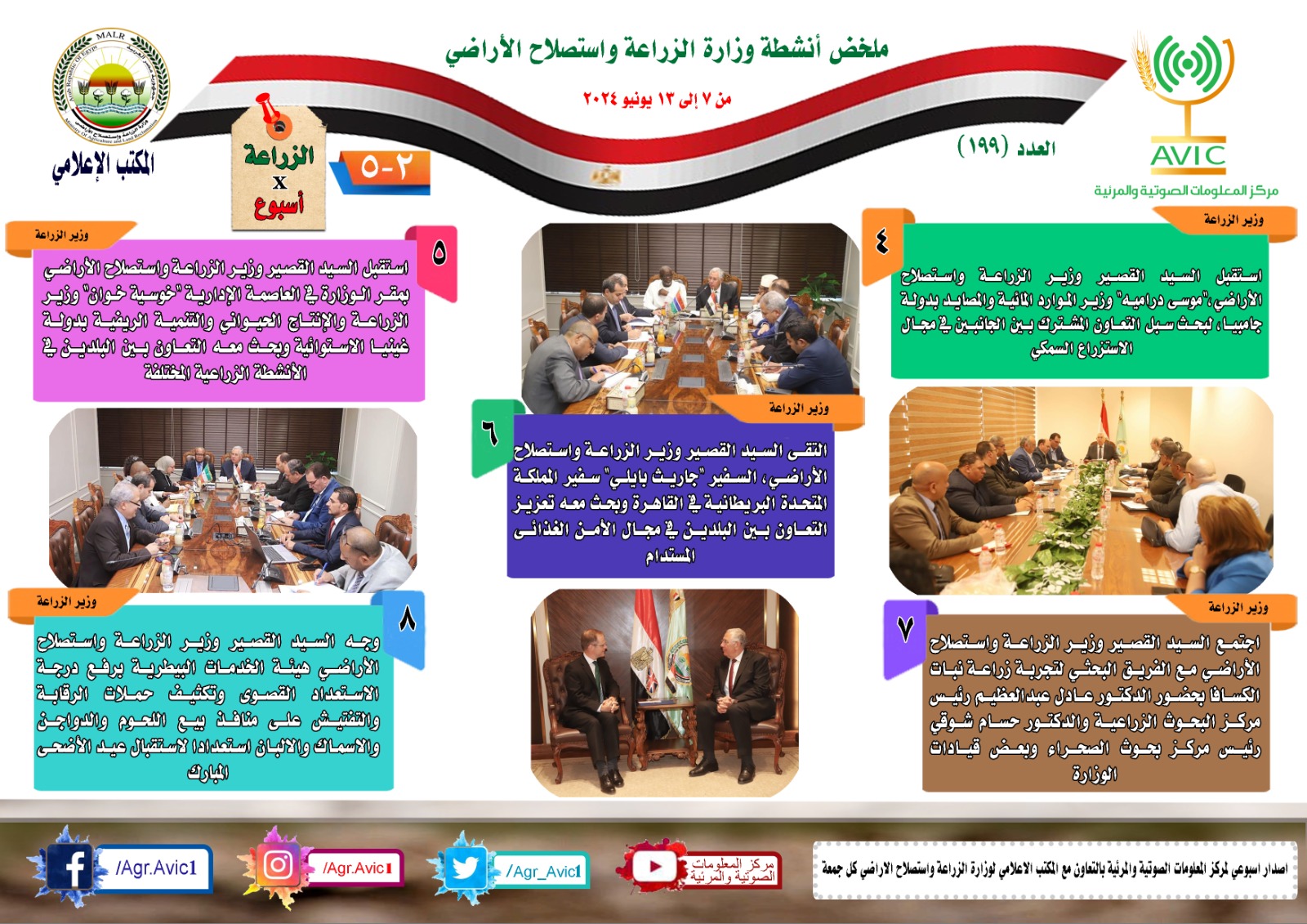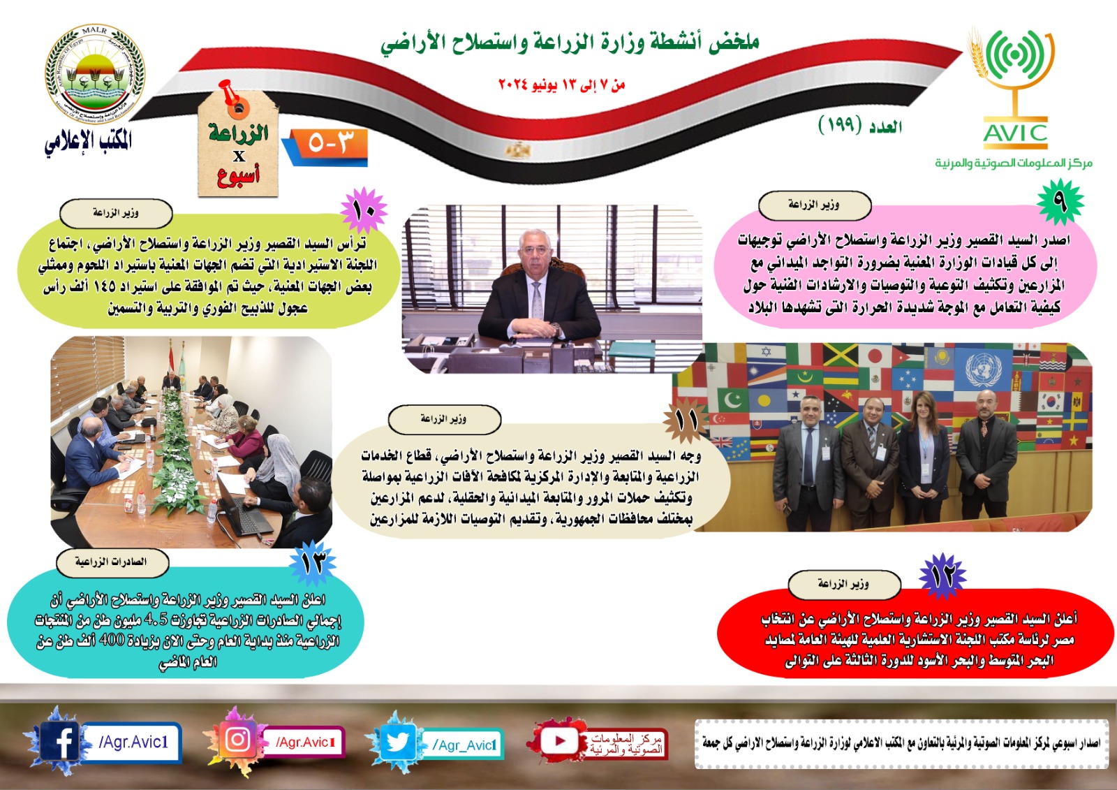 أصدر مركز المعلومات الصوتية والمرئية، التابع لوزارة الزراعة واستصلاح الأراضي، "الانفوجراف الاسبوعي" في نسخته رقم ١٩٩ حول الحصاد الاسبوعي لأهم أنشطة الوزارة، خلال الاسبوع الماضي في الفترة من ٧ وحتى ١٢ يونيو الجاري، وذلك بالتعاون مع المكتب الاعلامي للوزارة، كما أصدر المركز ايضا ملخصا بالفيديو، حول انشطة الوزارة خلال نفس الفترة.