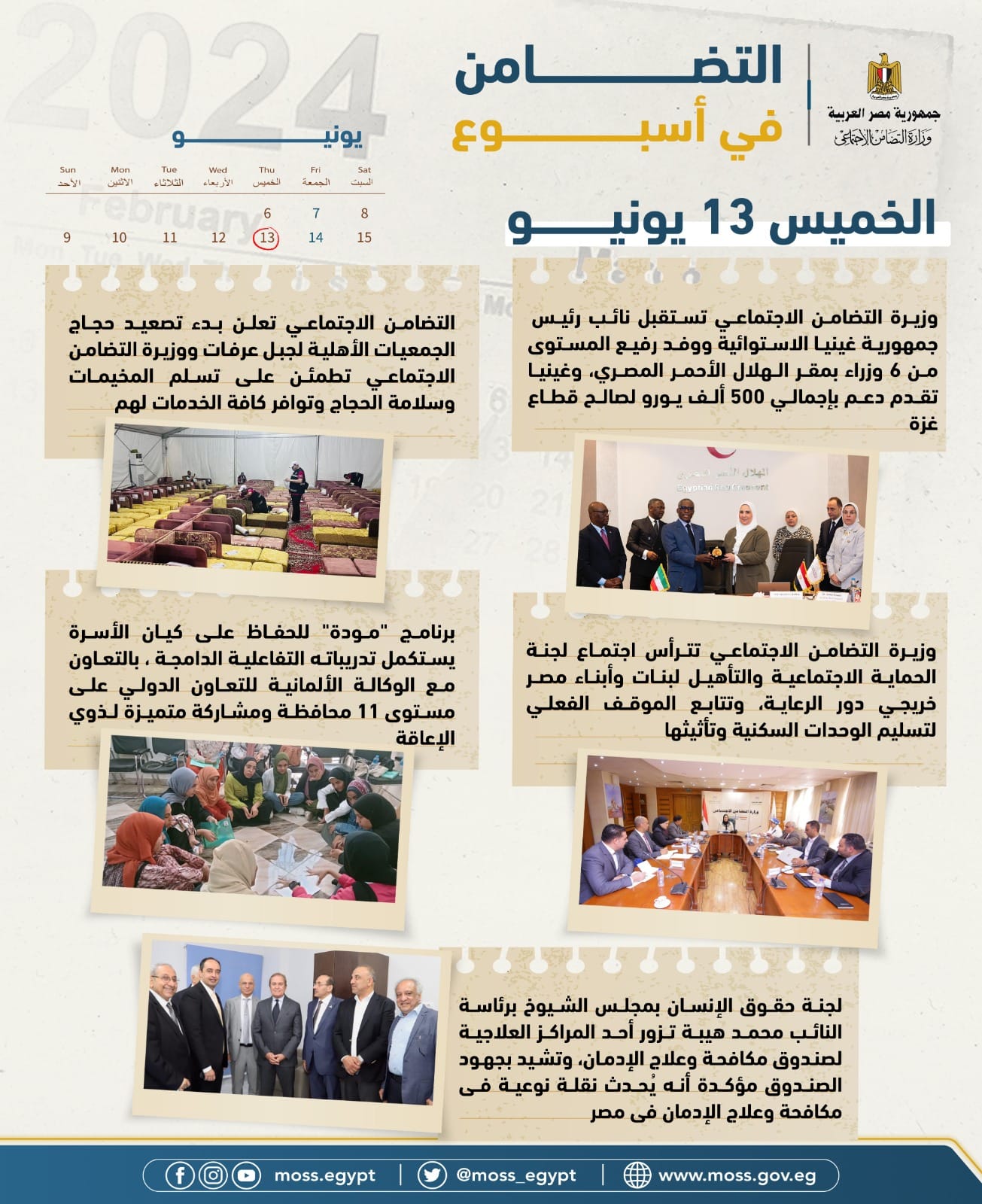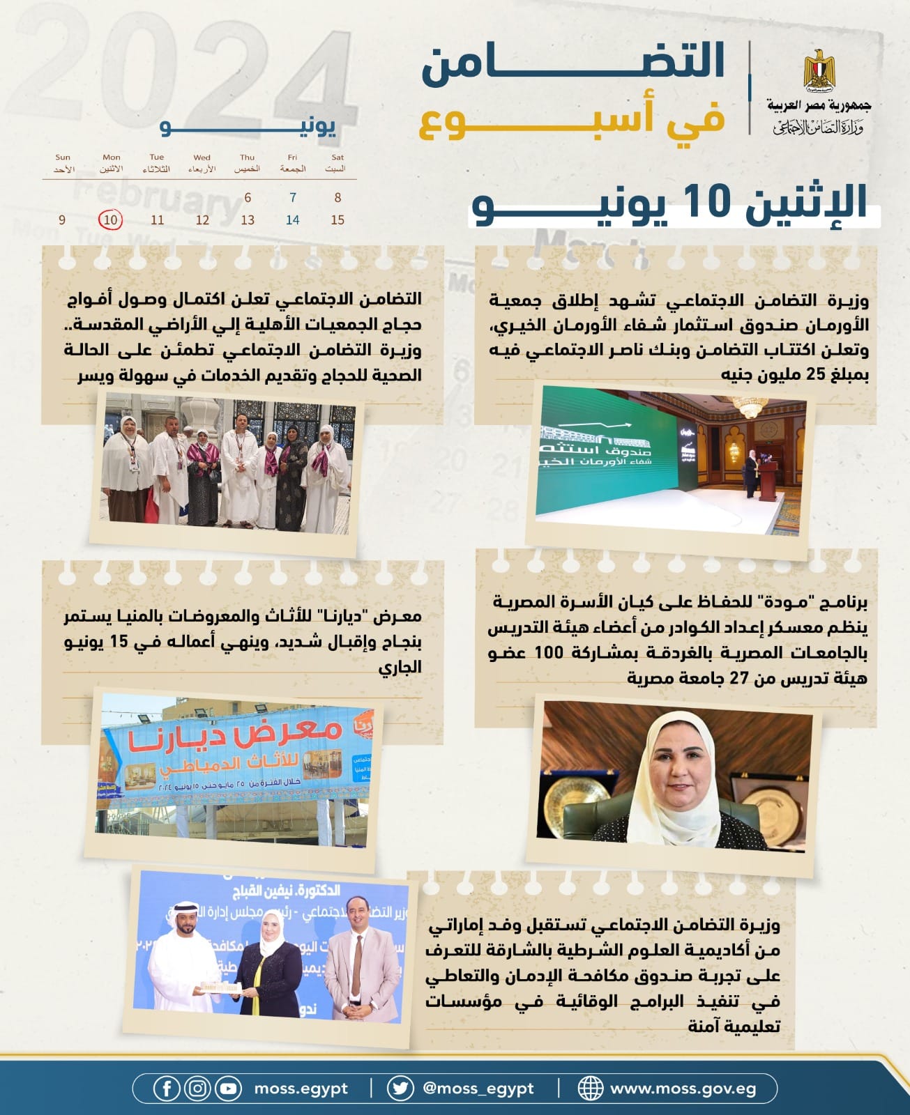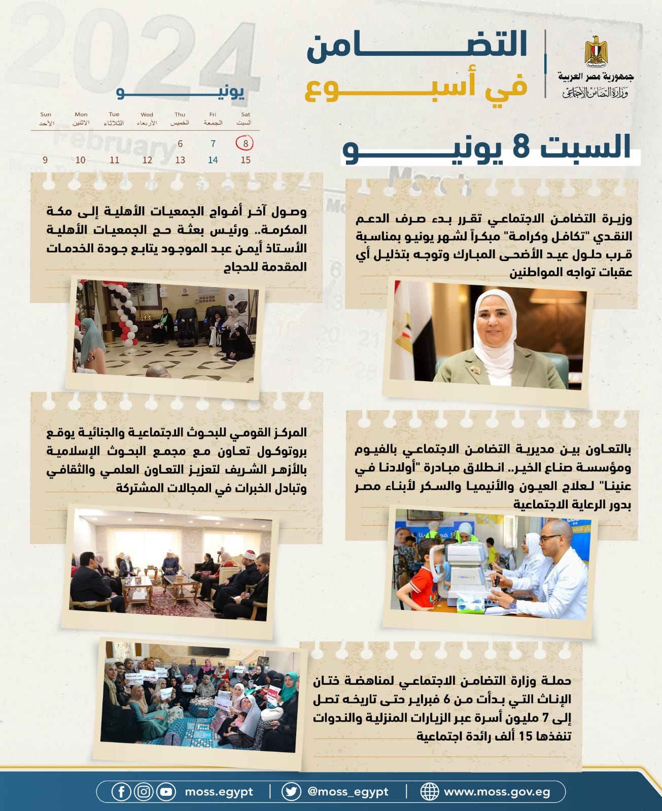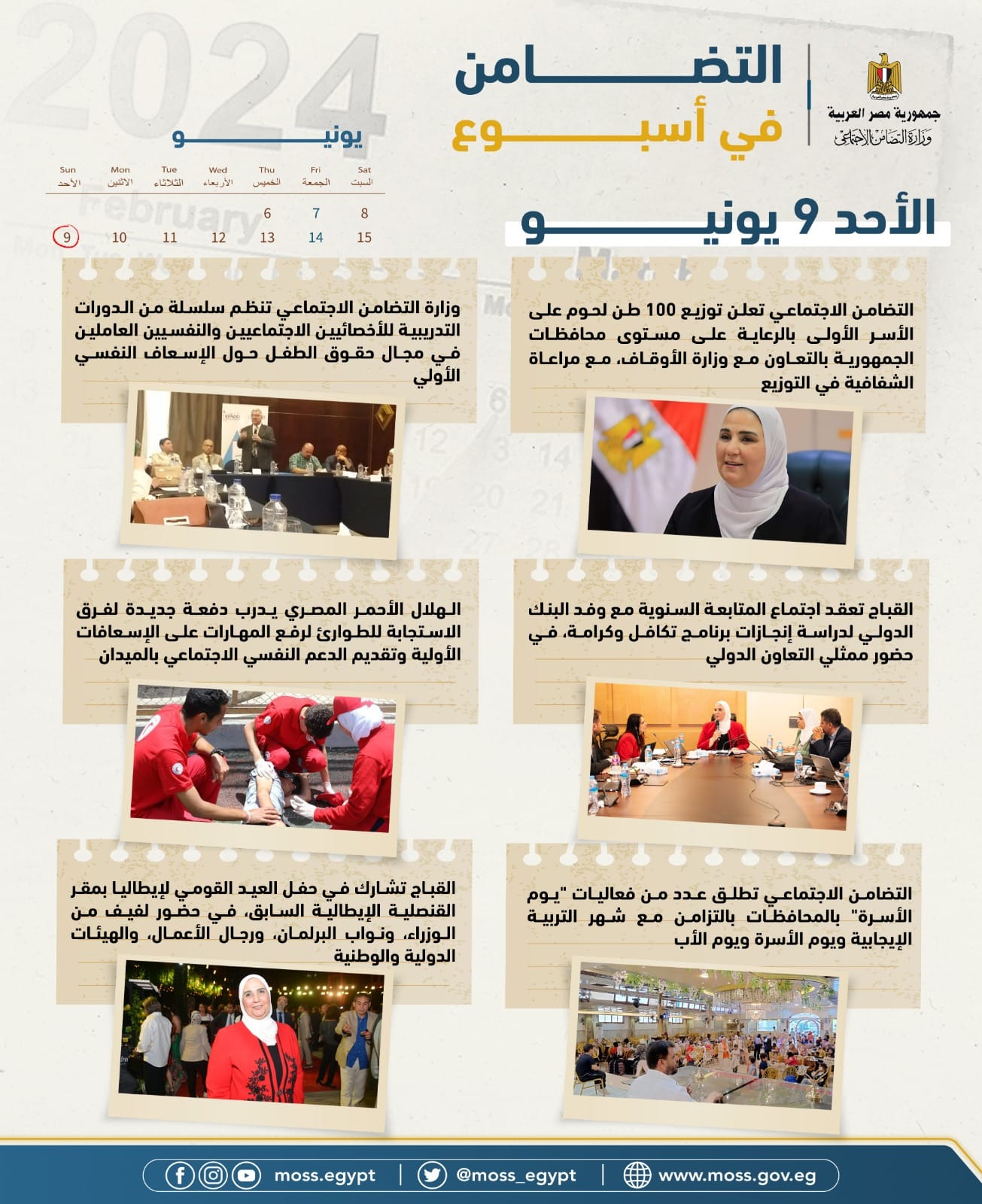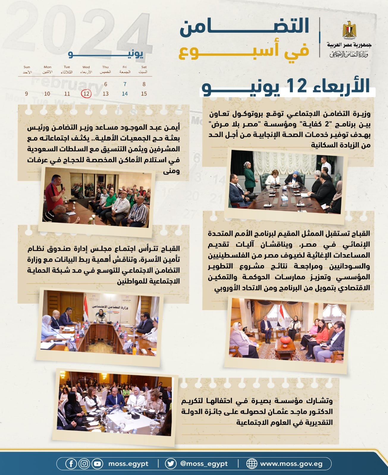 أصدرت وزارة التضامن الاجتماعي تقريرها الأسبوعي بالإنفوجراف والفيديو، حيث تستعرض من خلاله الأنشطة والأحداث، التي قامت بها السيدة نيفين القباج وزيرة التضامن الاجتماعي، وكذلك قطاعات الوزارة المختلفة خلال الفترة من من 8 يونيو إلى 13 يونيو 2024، ونستعرض أبرزها في التقرير التالي: