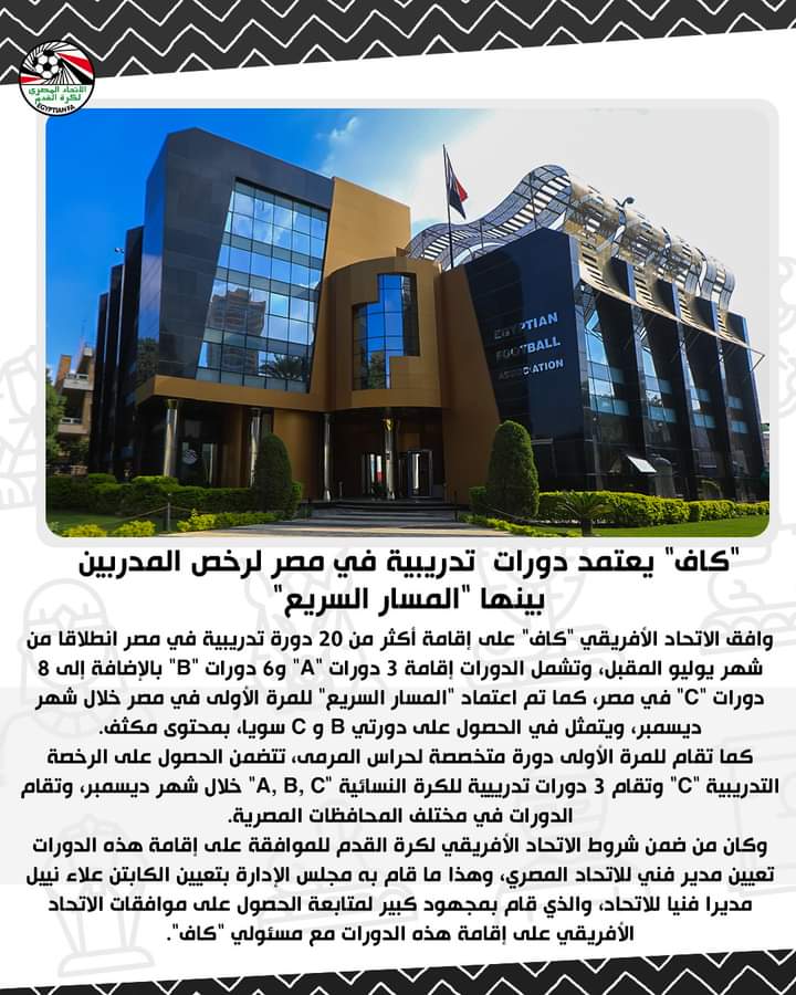 وافق الاتحاد الأفريقي "كاف" على إقامة أكثر من 20 دورة تدريبية في مصر انطلاقًا من شهر يوليو المقبل، وتشمل الدورات إقامة 3 دورات "A" و6 دورات "B" بالإضافة إلى 8 دورات "C" في مصر، كما تم اعتماد "المسار السريع" للمرة الأولى في مصر خلال شهر ديسمبر، ويتمثل في الحصول على دورتي B وC سويًا، بمحتوى مكثف.