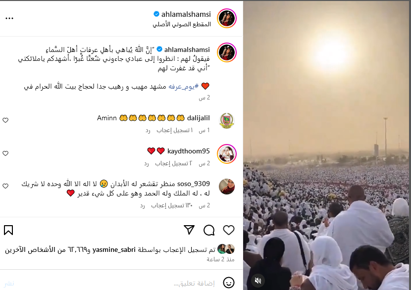 مع استمرار مشاعر الحج المقدسة في يوم عرفة، تفاعلت الفنانة أحلام مع الركن الأعظم من أركان الحج بالدعوات والثناء على وقوف الحجاج على جبل العرفات حتى تلون بالأبيض، وذلك عبر حسابها الرسمي على موقع تبادل الصور والفيديوهات “انسترجام”.