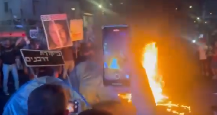 نشر رواد التواصل الاجتماعي لقطات عدة عن مظاهرات في تل أبيب من مواطنين إسرائيليين أشعلوا النيران في العاصمة الإسرائيلية مطالبين بإقالة الحكومة الإسرائيلية وإبرام صفقة مع حماس من أجل وقف إطلاق النارفي غزة وتبادل الأسرى.