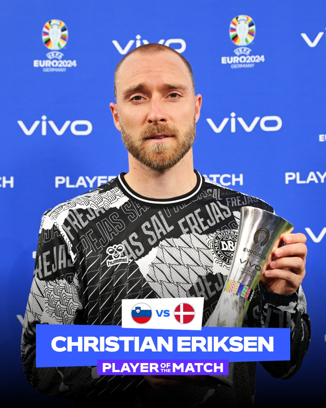 واستطاع كريستيان إريكسن تسجيل هدف الدنمارك الوحيد خلال تعادلهم مع سلوفينيا، وقدم مستويات جيدة حيث قام ب4 مراوغات ناجحة من 7 ودقة التمرير 88%، 8 الفوز بالثنائيات الأرضية.