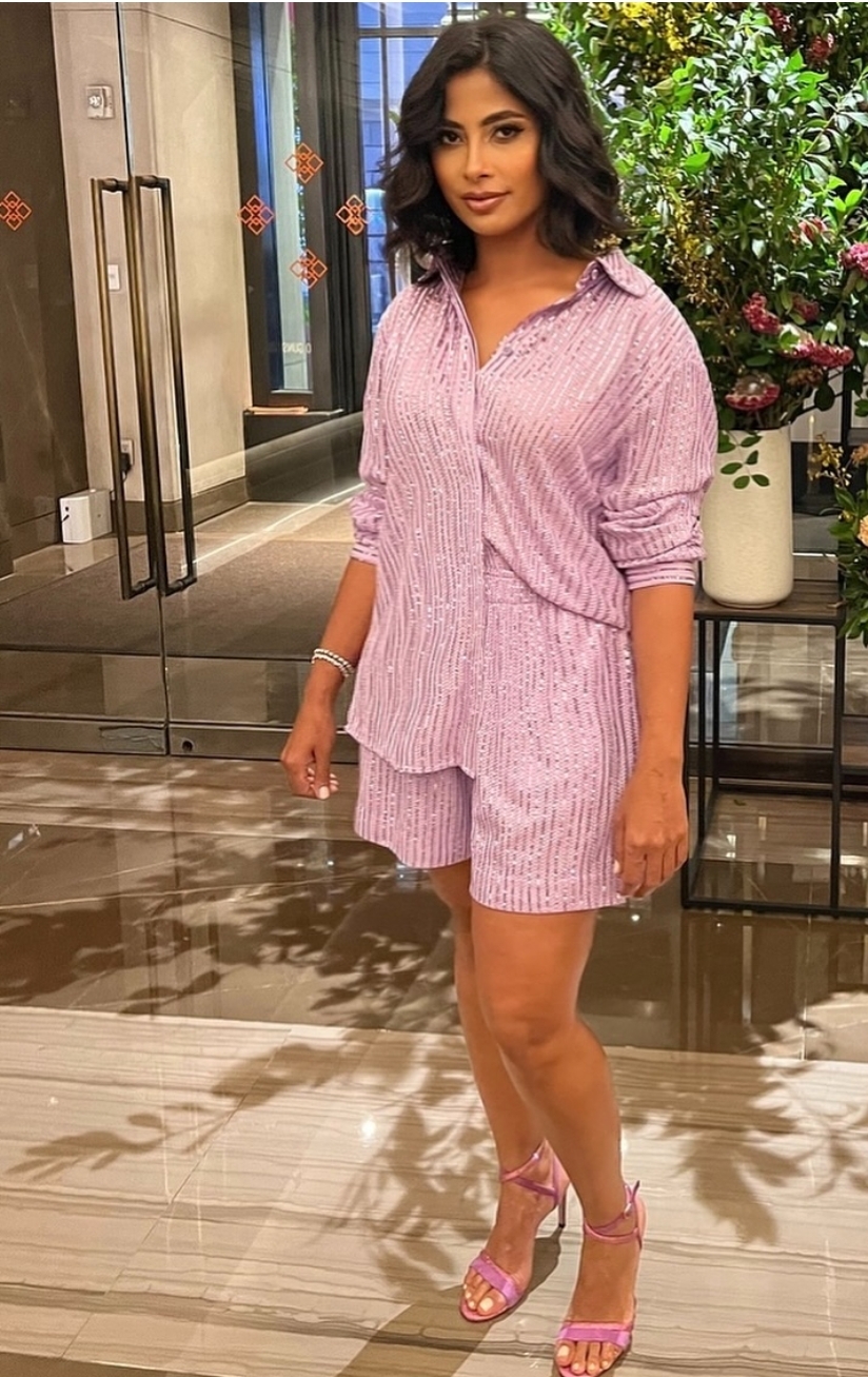 وبدت روبي بإطلالة صيفية جذابة، حيث ارتدت بدلة تنتمي لصيحة الهوت شورت صممت من قماش البايت باللون الكشمير.