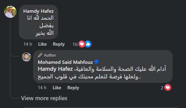 علق حمدي حافظ على المنشور الذي نفى من خلاله محمد سعيد محفوظ، مدير معهد الأهرام الإقليمي والإعلامي بقناة "cbc"، خبر وفاة الفنان، حيث قال: "الحمد لله نا بفضل الله بخير"، ليرد عليه محفوظ قائلًا: "أدام الله عليك الصحة والسلامة والعافية، ولعلها فرصة لتعلم محبتك في قلوب الجميع".