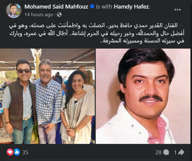 وكتب محفوظ: "الفنان القدير حمدي حافظ بخير .. اتصلت به واطمأننت على صحته، وهو في أفضل حال والحمدلله، وخبر رحيله في الحرم إشاعة.. أطال الله في عمره، وبارك في سيرته الحسنة ومسيرته المشرفة".