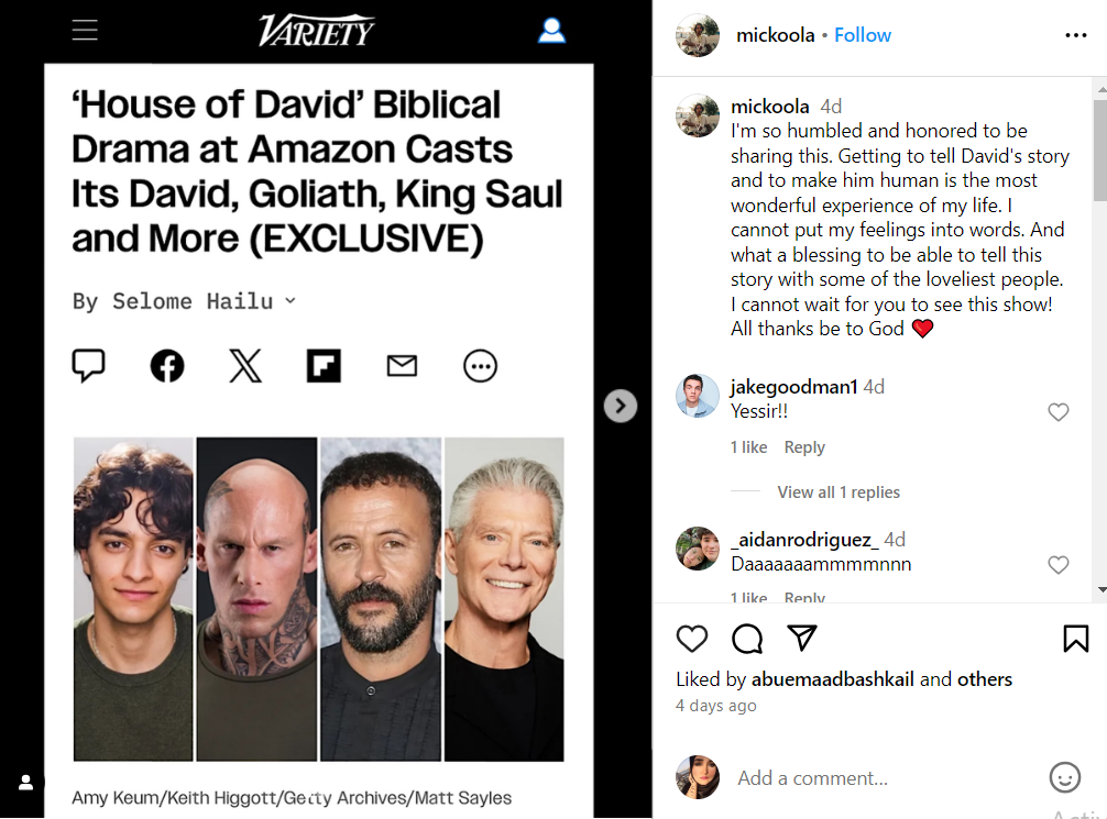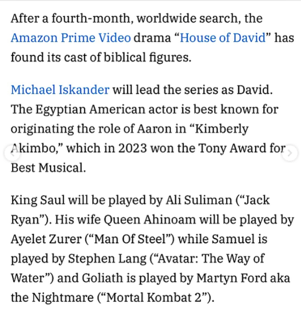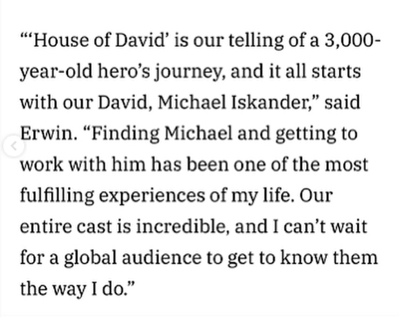 أعرب مايكل اسكندر عن سعادته البالغة للمشاركة في المسلسل الإسرائيلي "بيت داود"، ولك خلال منشور عبر حسابه الشخصي على موقع "انستجرام" حيث قال: "أشعر بالتواضع والشرف لمشاركتي في هذا العمل".