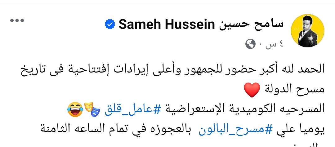 وكتب سامح حسين، عبر صفحته قائلا: "الحمد لله أكبر حضور للجمهور وأعلى إيرادات افتتاحية في تاريخ مسرح الدولة..