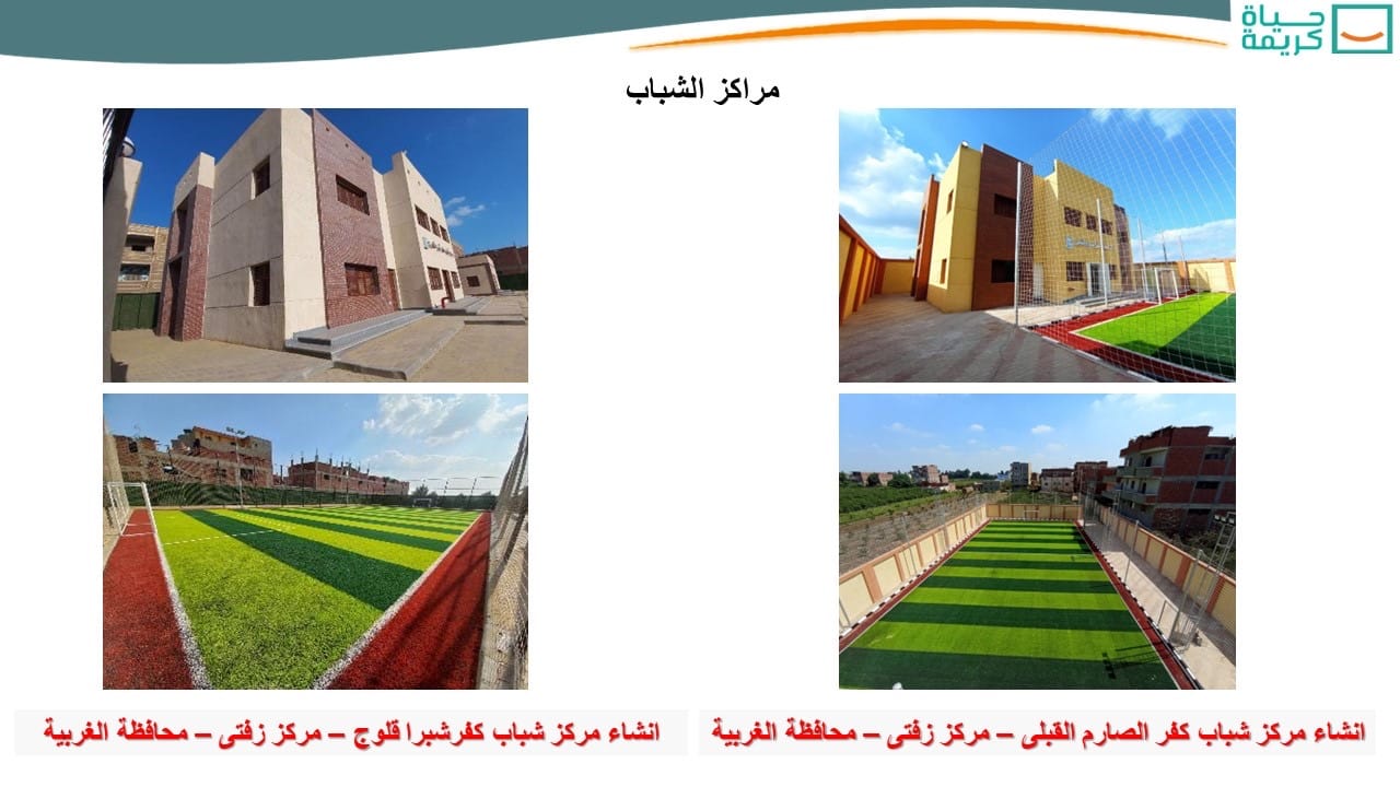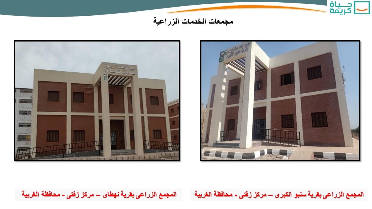 وأضاف اللواء محمود نصار: تم تنفيذ 26 مجمعا للخدمات الزراعية، والتى تُنفذ على مستوى الوحدات المحلية لتقديم الخدمة لباقى القرى والتوابع، وتضم (وحدة بيطرية - جمعية زراعية - مركز تجميع ألبان - مركز إرشاد) بما يسهم في تنمية هذه القرى، كما تم الانتهاء من الأعمال بـ71 مركز شباب (إنشاء - رفع كفاءة)، وتضم هذه المراكز، ملاعب ومسطحات خضراء، وكافتريات، ومنطقة ألعاب أطفال، ومبنى أنشطة رياضية، يشتمل على (حضانة - مكتبة - جيم - صالة ألعاب - صالات أنشطة).