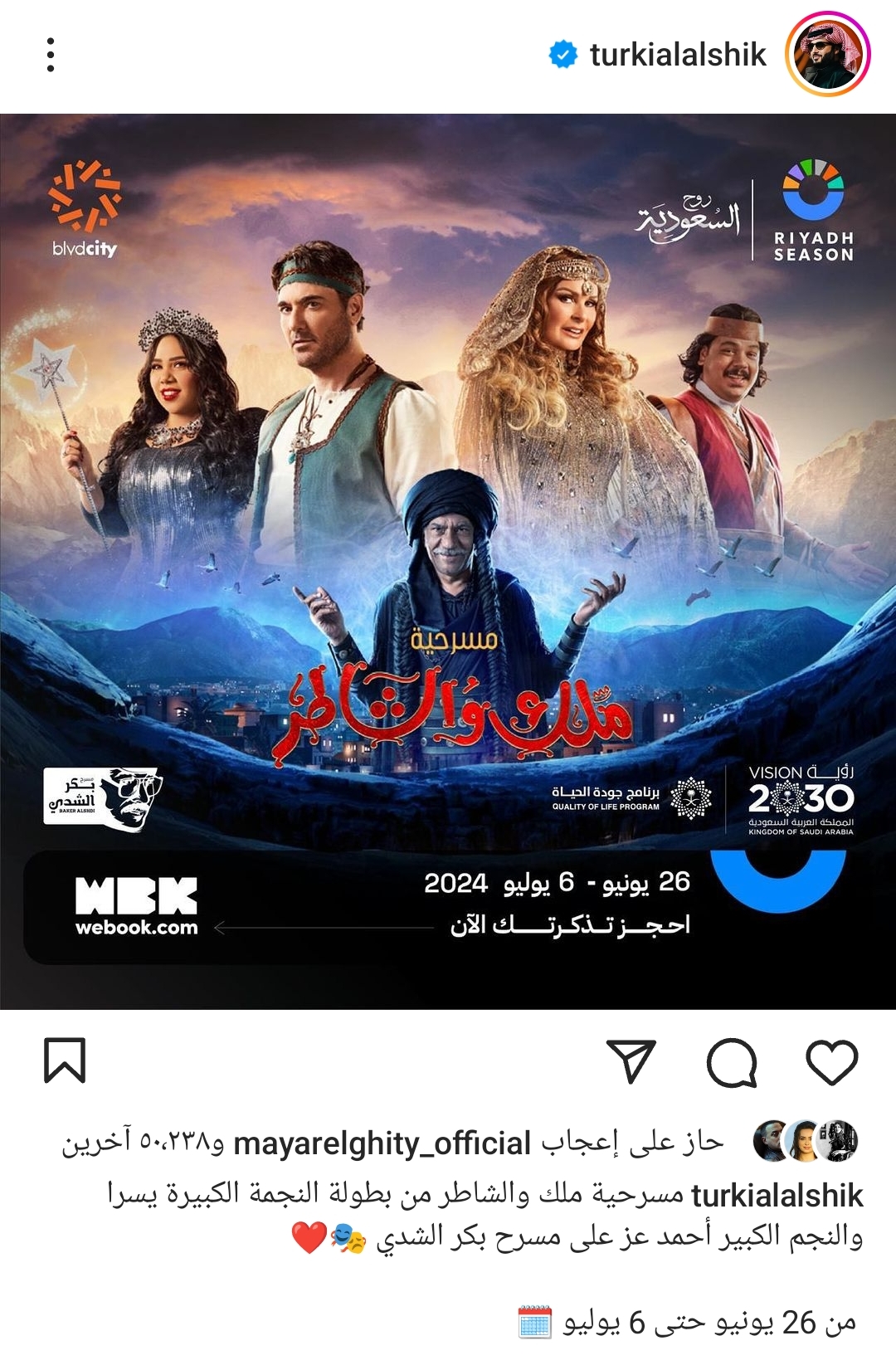 وكتب تركي آل الشيخ، عبر حسابه الرسمي قائلا : "مسرحية ملك والشاطر من بطولة النجمة الكبيرة يسرا والنجم الكبير أحمد عز على مسرح بكر الشدي من 26 يونيو حتى 6 يوليو.