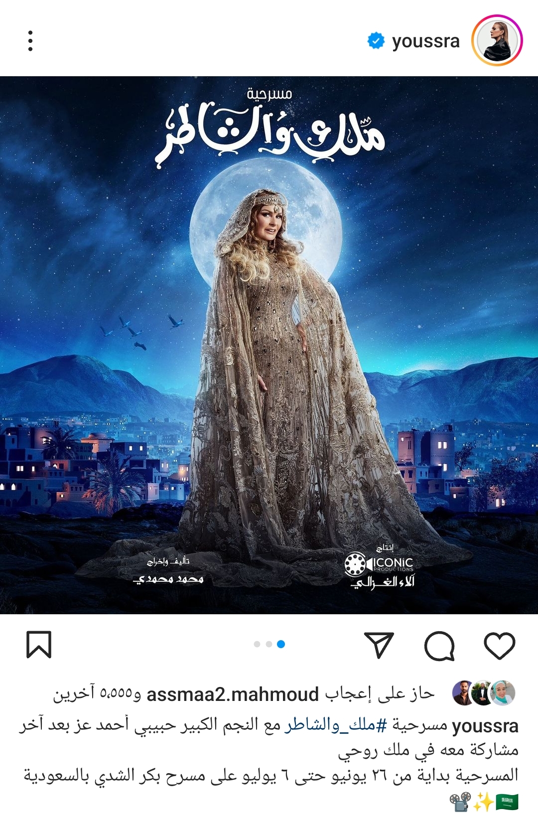 وروجت الفنانة يسرا، لأحدث أعمالها المسرحية "ملك والشاطر" بمشاركة الفنان أحمد عز، وذلك عبر حسابها الرسمي على موقع تبادل الصور والفيديوهات الشهير انستجرام.
