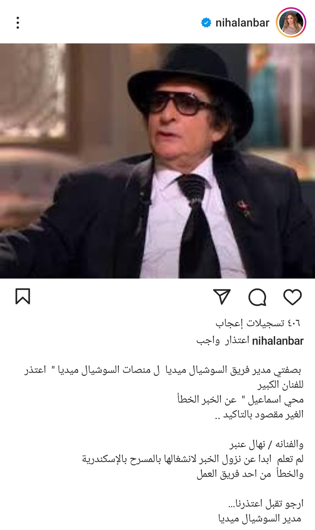 وكتبت عبر حسابها الرسمي، قائلة: "اعتذار واجب.. بصفتي مدير السوشيال ميديا لمنصات السوشيال ميديا أعتذر للفنان الكبير محيي إسماعيل عن الخبر الخاطئ غير المقصود بالتأكيد".