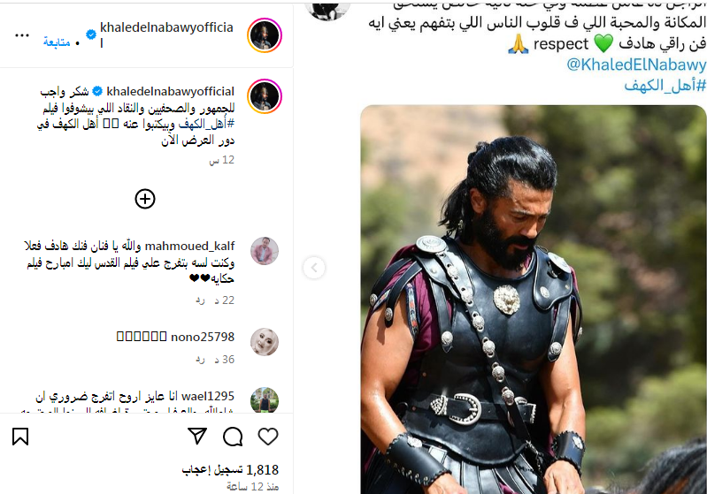 وكتب خالد النبوي، عبر حسابه، قائلًا: "شكر واجب للجمهور والصحفيين والنقاد الذين يشاهدون فيلم أهل الكهف ويكتبون عنه. أهل الكهف في دور العرض الآن".