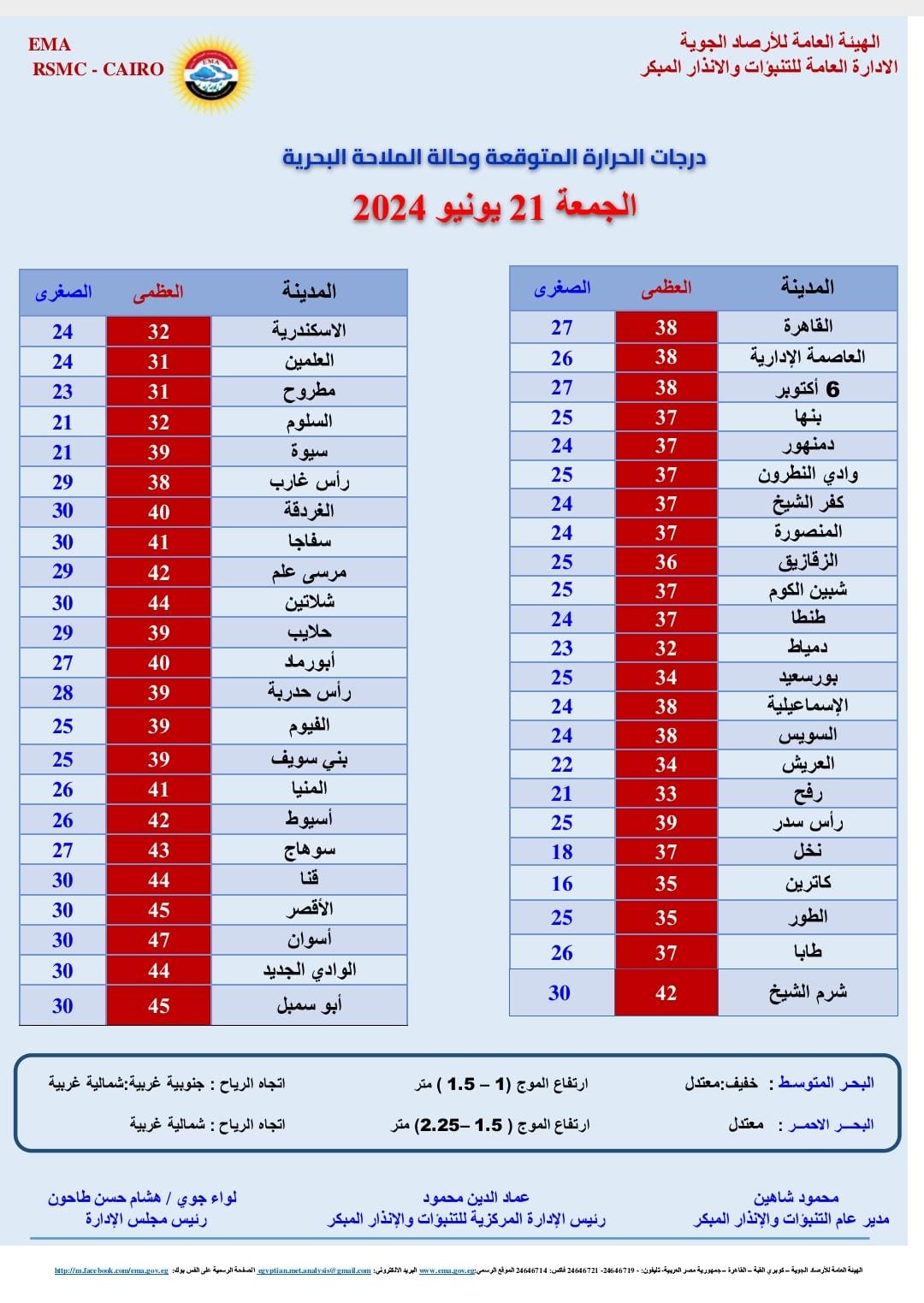 تستمر درجات الحرارة، اليوم الجمعة الموافق 21 يونيو، في الارتفاع التدريجي على شمال البلاد حتى القاهرة الكبرى بقيم من (2-3) درجة، ويسود اليوم طقس شديد الحرارة نهارًا على أغلب الأنحاء، حار على السواحل الشمالية، ويكون مائل للحرارة ليلًا على أغلب الأنحاء معتدل على السواحل الشمالية.