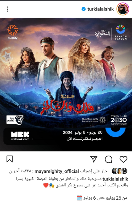 كان المستشار تركي آل الشيخ، رئيس هيئة الترفيه السعودية، أعلن موعد عرض مسرحية "ملك والشاطر" بالمملكة العربية السعودية، وذلك عبر حسابه الرسمي على موقع تبادل الصور والفيديوهات الشهير “إنستجرام”.