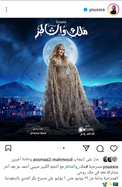 روجت الفنانة يسرا لأحدث أعمالها المسرحية "ملك والشاطر"، بمشاركة الفنان أحمد عز، وذلك عبر حسابها الرسمي على موقع تبادل الصور والفيديوهات الشهير إنستجرام.