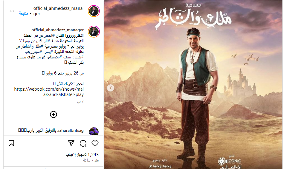 ونشر النجم أحمد عز، البوستر الدعائي للمسرحية، عبر حسابه الرسمي "إنستجرام"، وعلق عليه قائلًا: “انتظروا الفنان أحمد عز في المملكة العربية السعودية، مدينة الرياض، من يوم 26 يونيو إلى 6 يوليو، بمسرحية ”ملك والشاطر"، بطولة النجمة الكبيرة يسرا، وسيد رجب، وشيماء سيف، ومصطفى غريب.. على مسرح بكر الشدي".