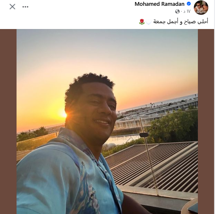 شارك النجم محمد رمضان جمهوره بصورة جديدة مع شروق الشمس وعلق عليها قائلًا :" أحلى صباح و أجمل جمعة 🤍" ،وذلك عبر صفحته الرسمية على منصة فيسبوك.