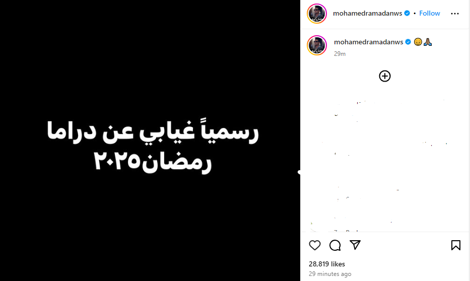 وكان قد أثار رمضان حيرة جمهوره مؤخرًا بعدما نشر على صفحته الرسمية على موقع تبادل الصور والفيديوهات الأشهر انستجرام منشور مفاده غيابه عن الموسم الرمضاني 2025، حيث كتب"رسمياً غيابي عن دراما رمضان٢٠٢٥".