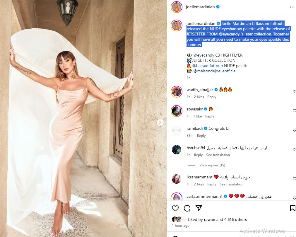وظهرت جويل ماردينيان في أحدث ظهور لها عبر الإنستجرام، وهي تروج لظلال الجفون وهي ترتدي فستان طويل ومجسم، يشبه في تصميمه قميص نوم صمم من الساتان باللون البيج مع الحرير، مما عكس تناسق قوامها بشكل لافت.