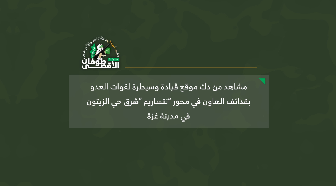 نشرت كتائب القسام، مشاهد استهداف موقع قيادة وسيطرة تابعة للاحتلال الإسرائيلي،  بقذائف الهاون في محور "نتساريم" شرق حي الزيتون في مدينة غزة، ما أدى لمقتل اثنين من جنود الاحتلال خلال تلك العملية.