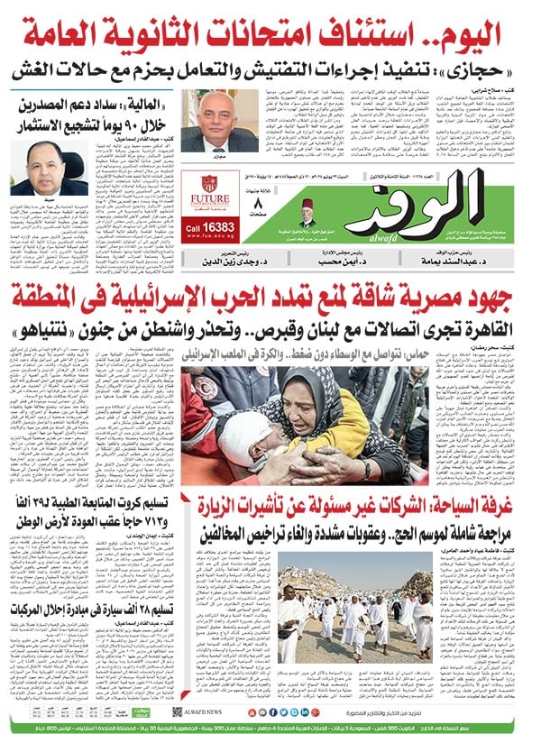 تنشر جريدة الوفد في عددها الصادر، غدًا السبت، العديد من الموضوعات والتقارير الإخبارية المهمة، أبرزها: "اليوم.. استئناف امتحانات الثانوية العامة".