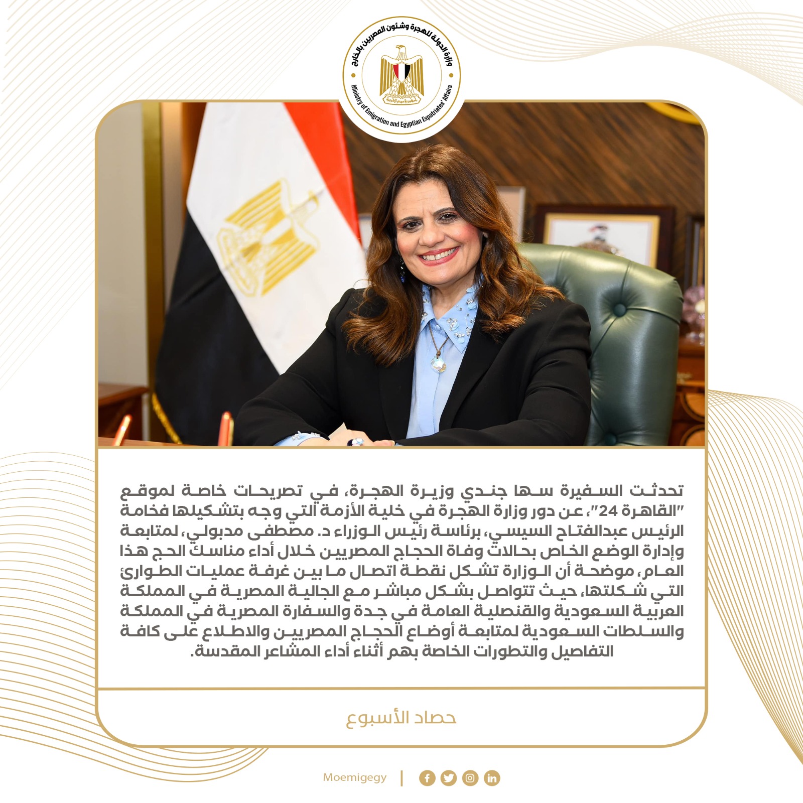 وزيرة الهجرة تتابع مستجدات الحجاج المصريين بالسعودية.. حصاد الأسبوع