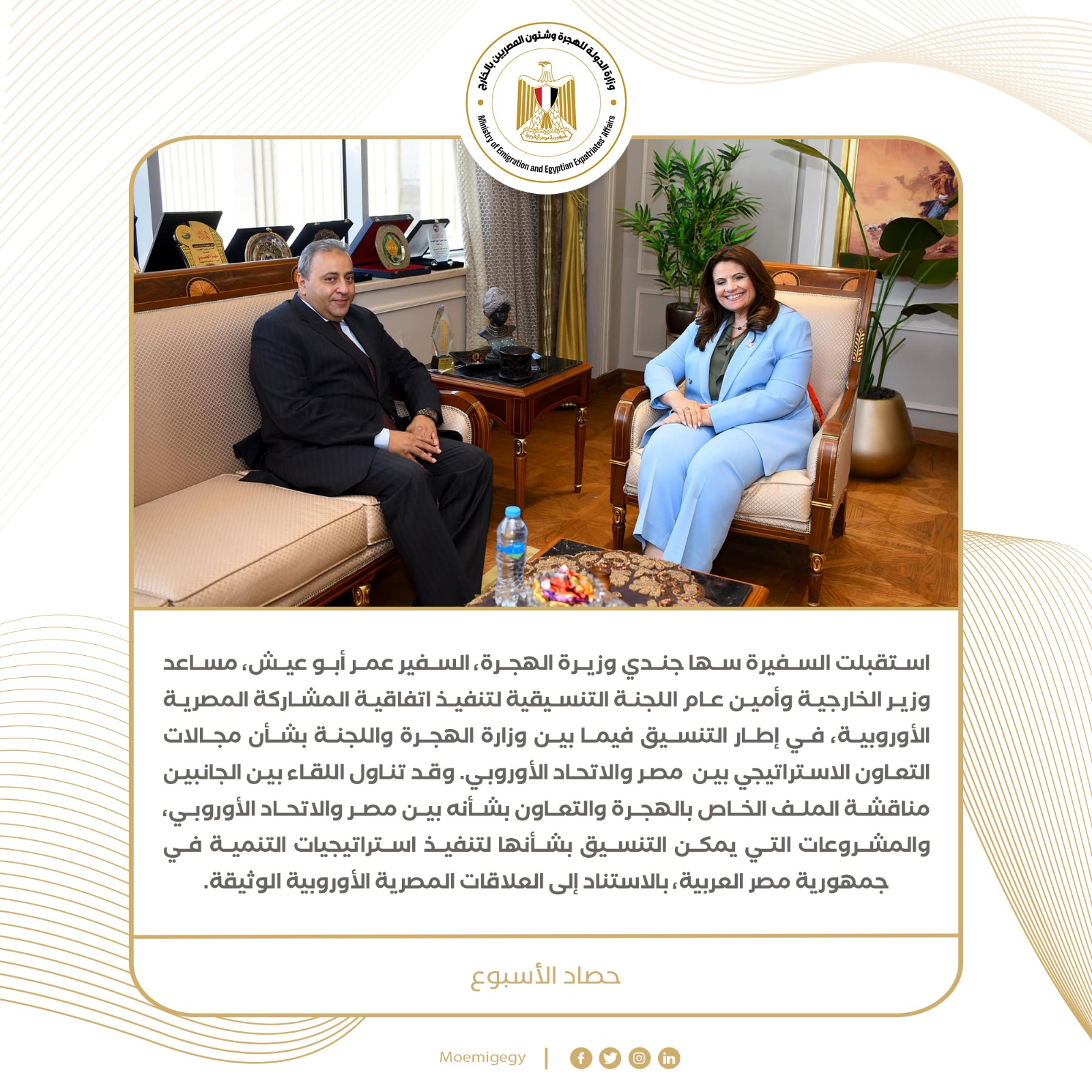 2- استقبلت السفيرة سها جندي وزيرة الهجرة، السفير عمر أبو عيش، مساعد وزير الخارجية وأمين عام اللجنة التنسيقية لتنفيذ اتفاقية المشاركة المصرية الأوروبية، في إطار التنسيق فيما بين وزارة الهجرة واللجنة بشأن مجالات التعاون الاستراتيجي بين  مصر والاتحاد الأوروبي. وقد تناول اللقاء بين الجانبين مناقشة الملف الخاص بالهجرة والتعاون بشأنه بين مصر والاتحاد الأوروبي، والمشروعات التي يمكن التنسيق بشأنها لتنفيذ استراتيجيات التنمية في جمهورية مصر العربية، بالاستناد إلى العلاقات المصرية الأوروبية الوثيقة.