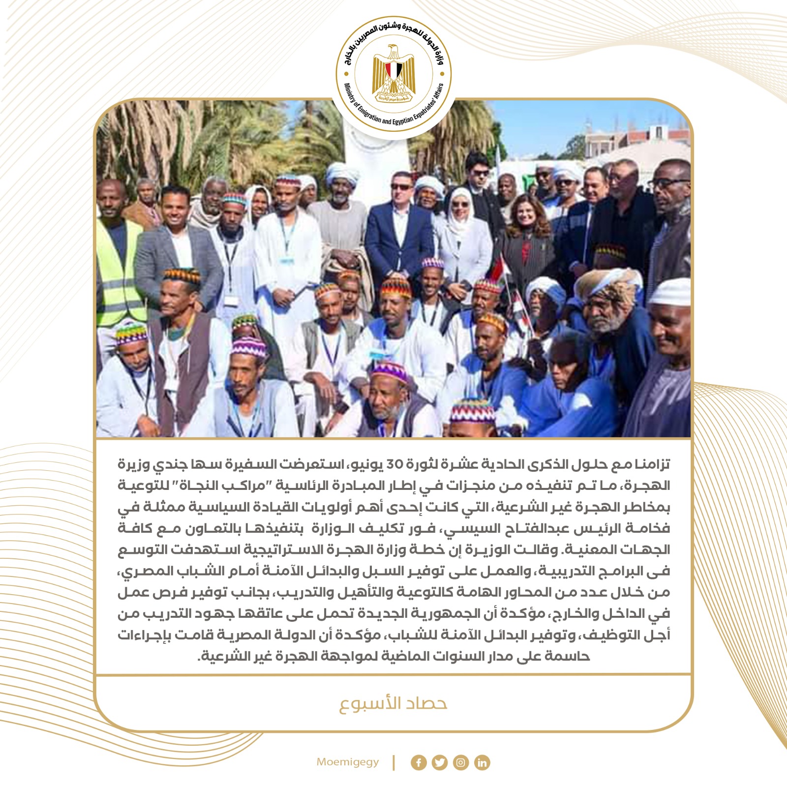 5- تزامنا مع حلول الذكرى الحادية عشرة لثورة 30 يونيو، استعرضت السفيرة سها جندي وزيرة الهجرة، ما تم تنفيذه من منجزات في إطار المبادرة الرئاسية "مراكب النجاة" للتوعية بمخاطر الهجرة غير الشرعية، التي كانت إحدى أهم أولويات القيادة السياسية ممثلة في فخامة الرئيس عبدالفتاح السيسي، فور تكليف الوزارة  بتنفيذها بالتعاون مع كافة الجهات المعنية. وقالت الوزيرة إن خطة وزارة الهجرة الاستراتيجية استهدفت التوسع فى البرامج التدريبية، والعمل على توفير السبل والبدائل الآمنة أمام الشباب المصري، من خلال عدد من المحاور الهامة كالتوعية والتأهيل والتدريب، بجانب توفير فرص عمل في الداخل والخارج، مؤكدة أن الجمهورية الجديدة تحمل على عاتقها جهود التدريب من أجل التوظيف، وتوفير البدائل الآمنة للشباب، مؤكدة أن الدولة المصرية قامت بإجراءات حاسمة على مدار السنوات الماضية لمواجهة الهجرة غير الشرعية.