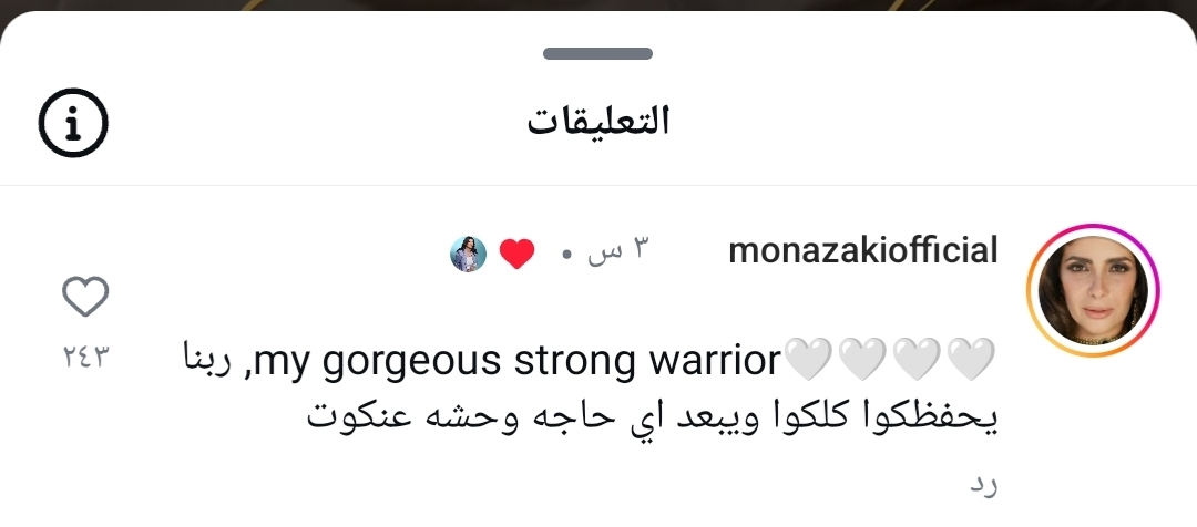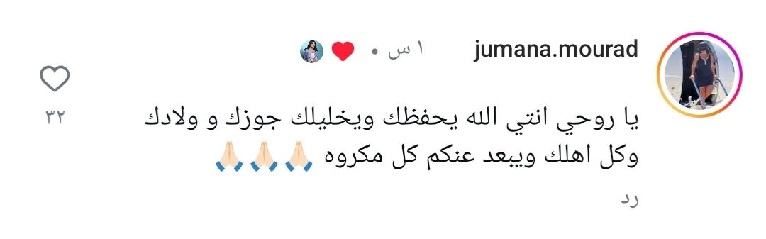 فيما علقت الفنانة جومانة مراد، قائلة: “يا روحي أنتي الله يحفظك ويخليلك جوزك وولادك وكل أهلك ويبعد عنكم كل مكروه".