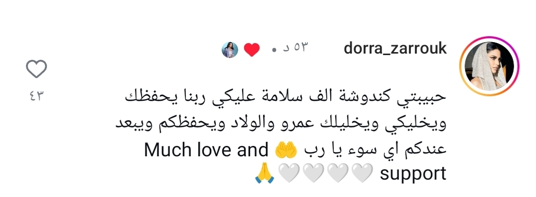 بينما قالت الفنانة درة: “حبيبتي كندوشة ألف سلامة عليكي ربنا يحفظك ويخليكي ويخليلك عمرو والولاد ويحفظكم ويبعد عنكم أي سوء يارب.. بحبك كتير وبدعمك".
