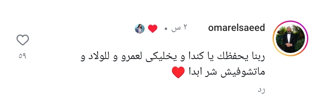 وعلق الفنان عمر السعيد، قائلًا: "ربنا يحفظك ياكندة ويخليكي لعمرو وللولاد وماتشوفيش شر أبدا".