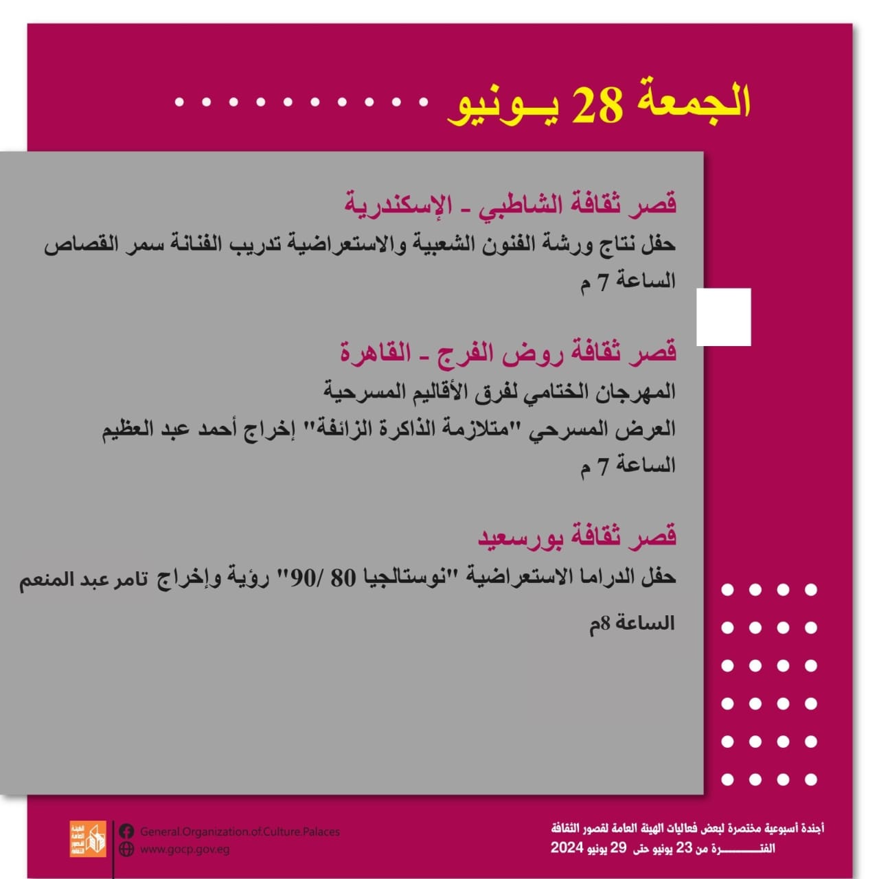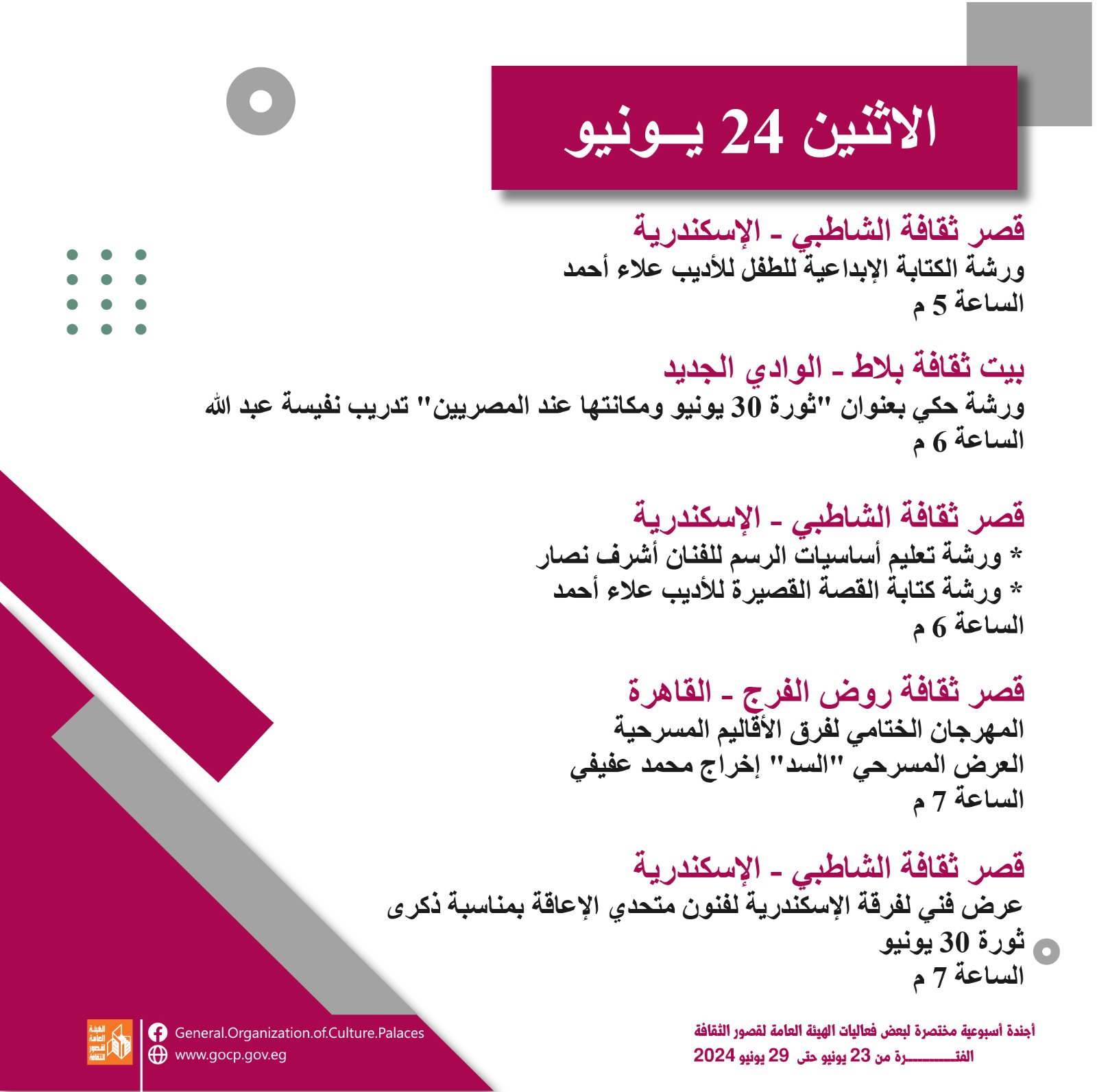 أجندة قصور الثقافة.. انطلاق احتفالات ثورة 30 يونيو ونوستالجيا 80/ 90 تصل بورسعيد