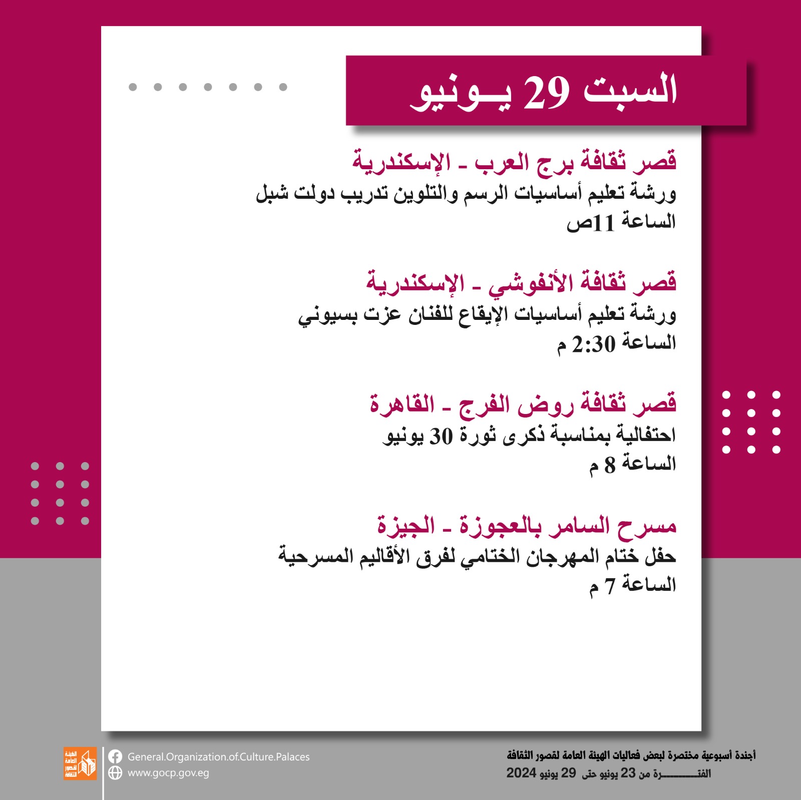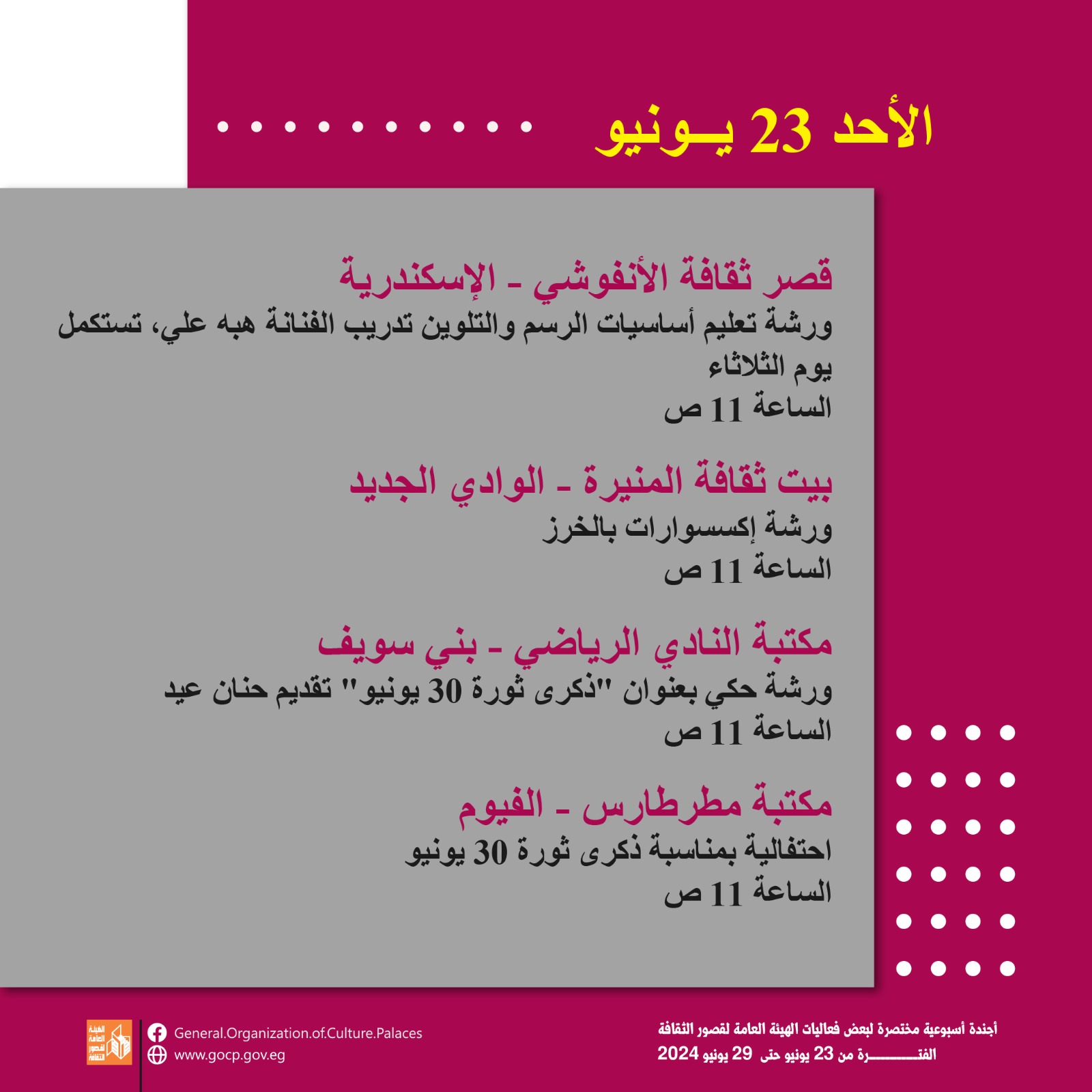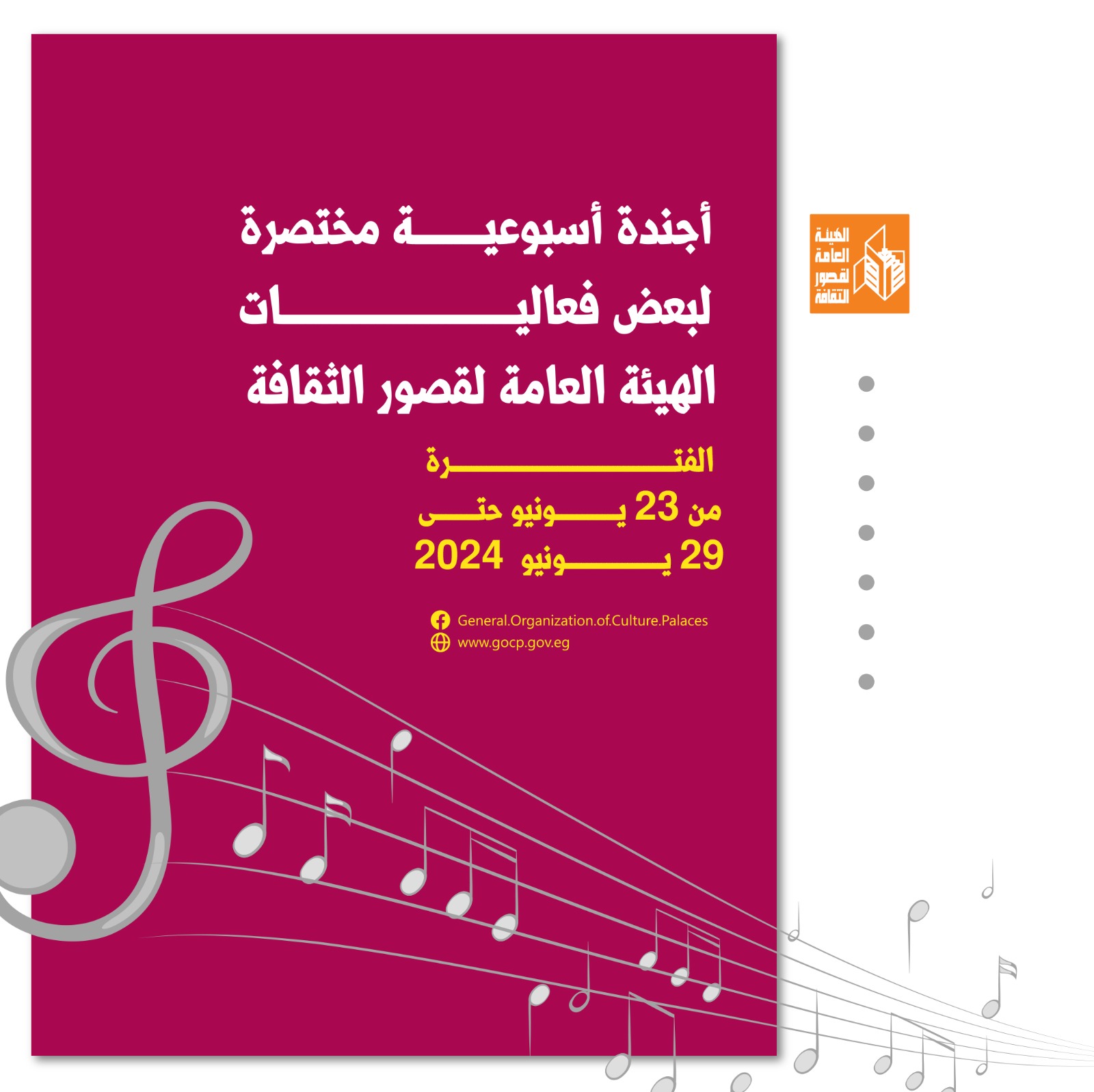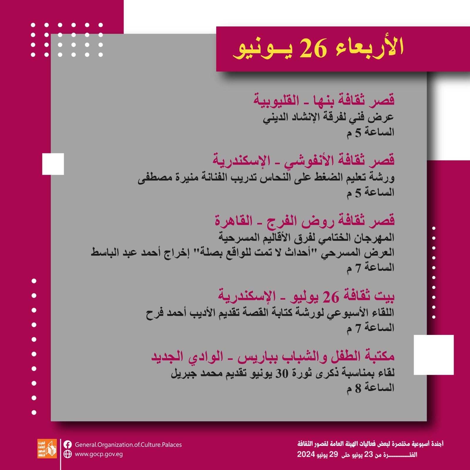 ضمن برامج وزارة الثقافة، وبرعاية الدكتورة نيفين الكيلاني، وزيرة الثقافة، أعدت الهيئة العامة لقصور الثقافة، برئاسة عمرو البسيوني، أجندة حافلة هذا الأسبوع تتضمن مجموعة متنوعة ومتميزة من الفعاليات الثقافية والفنية، بدءا من اليوم الأحد وحتى السبت المقبل 29 يونيو.