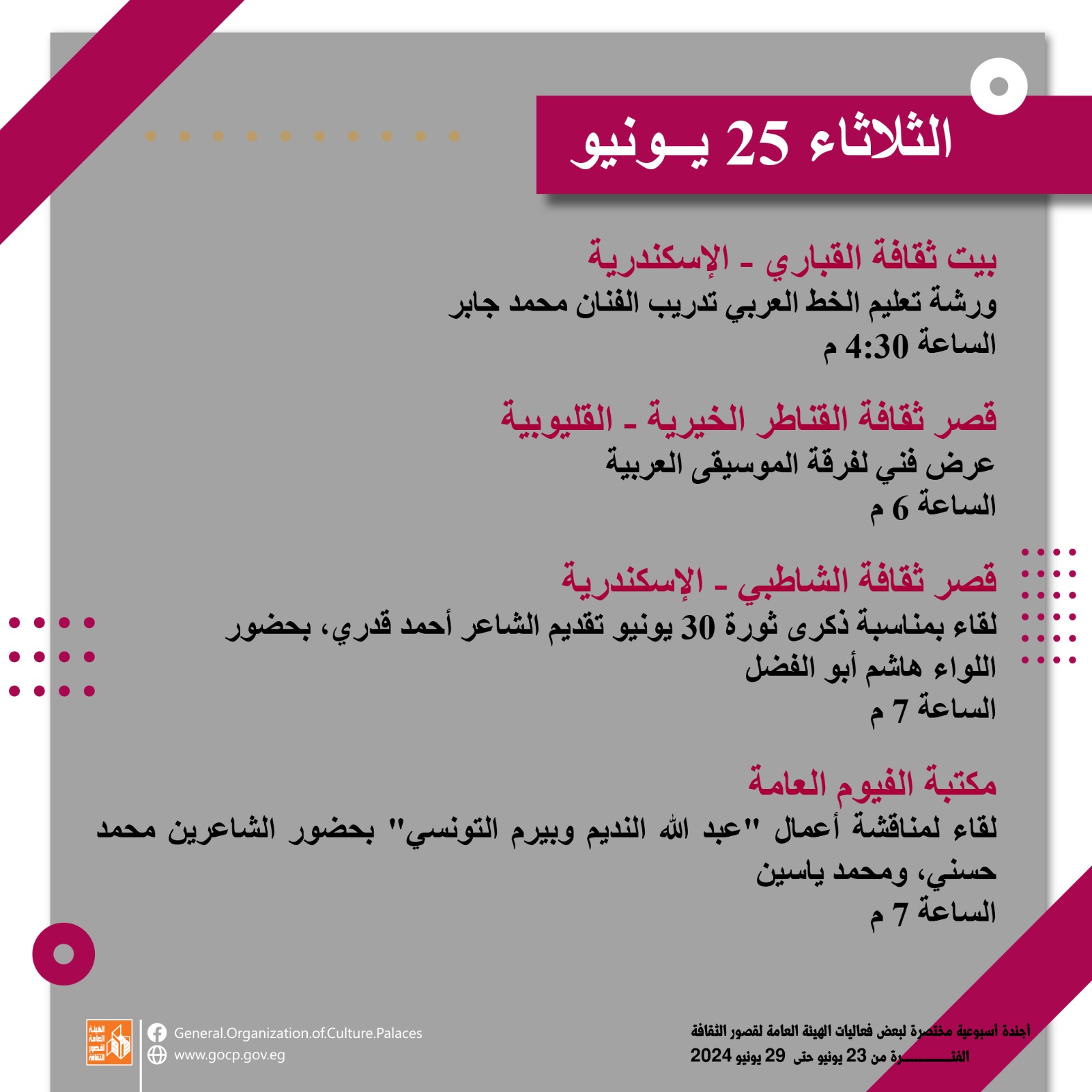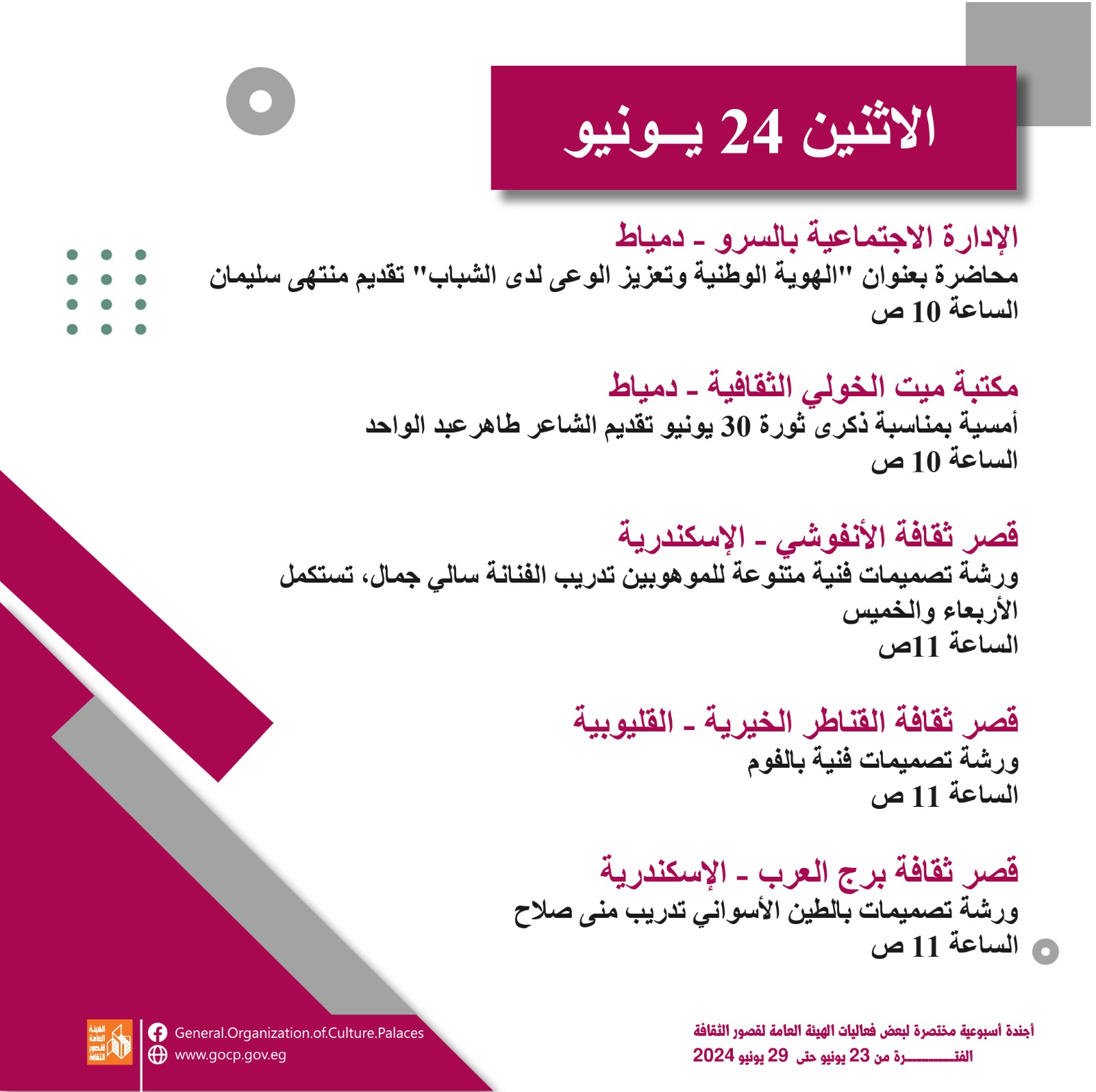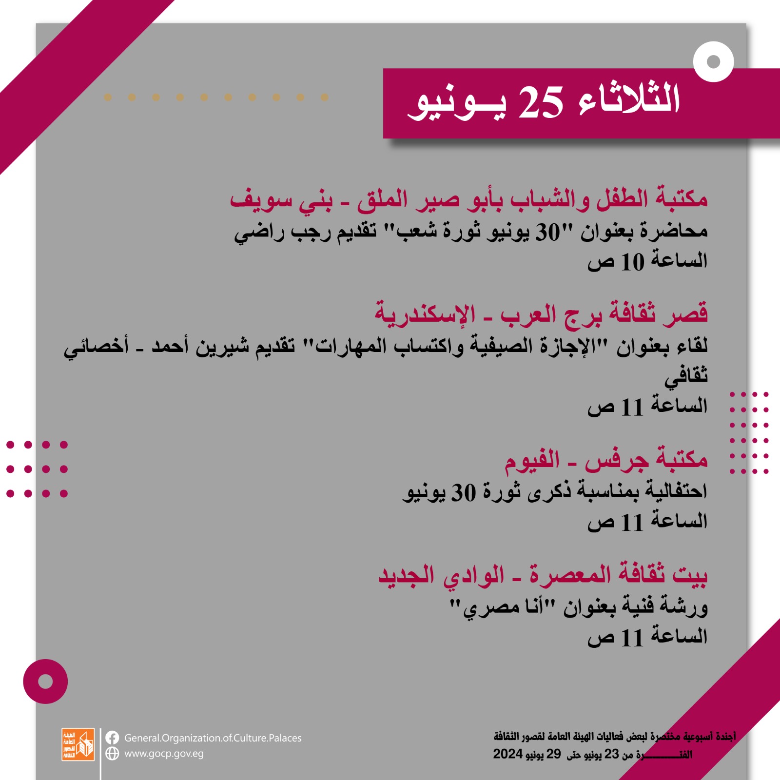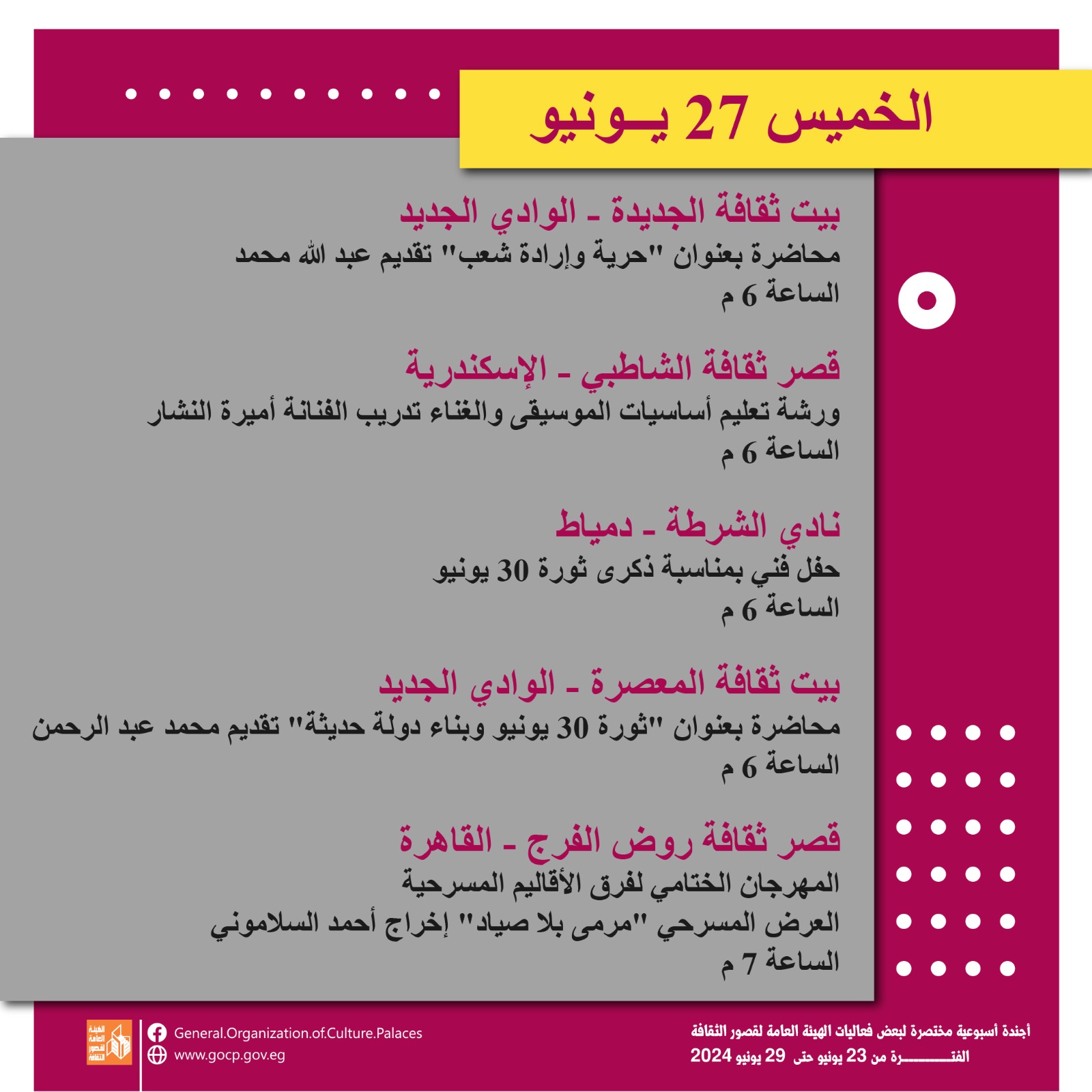 ضمن برامج وزارة الثقافة، وبرعاية الدكتورة نيفين الكيلاني، وزيرة الثقافة، أعدت الهيئة العامة لقصور الثقافة، برئاسة عمرو البسيوني، أجندة حافلة هذا الأسبوع تتضمن مجموعة متنوعة ومتميزة من الفعاليات الثقافية والفنية، بدءا من اليوم الأحد وحتى السبت المقبل 29 يونيو.