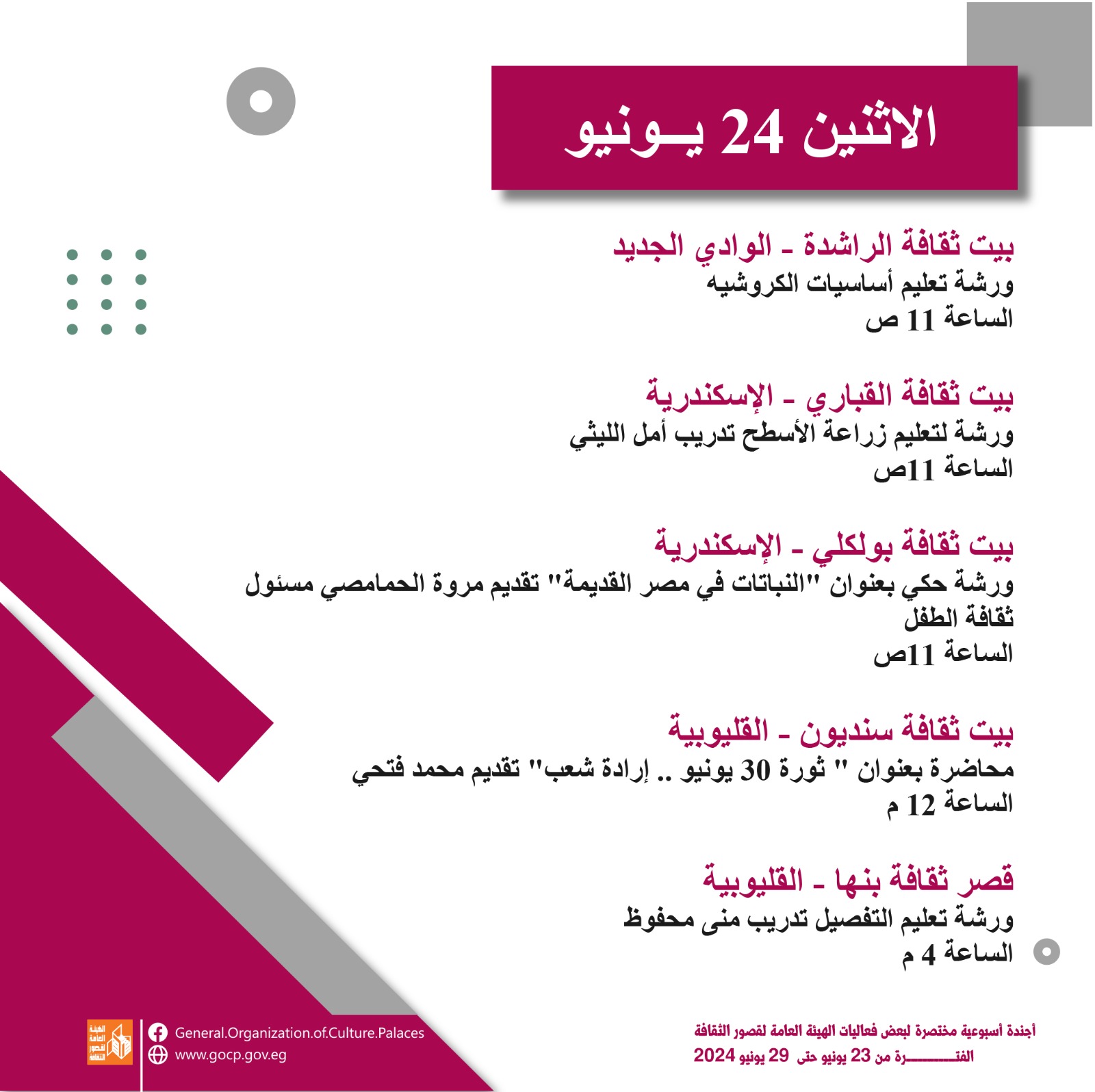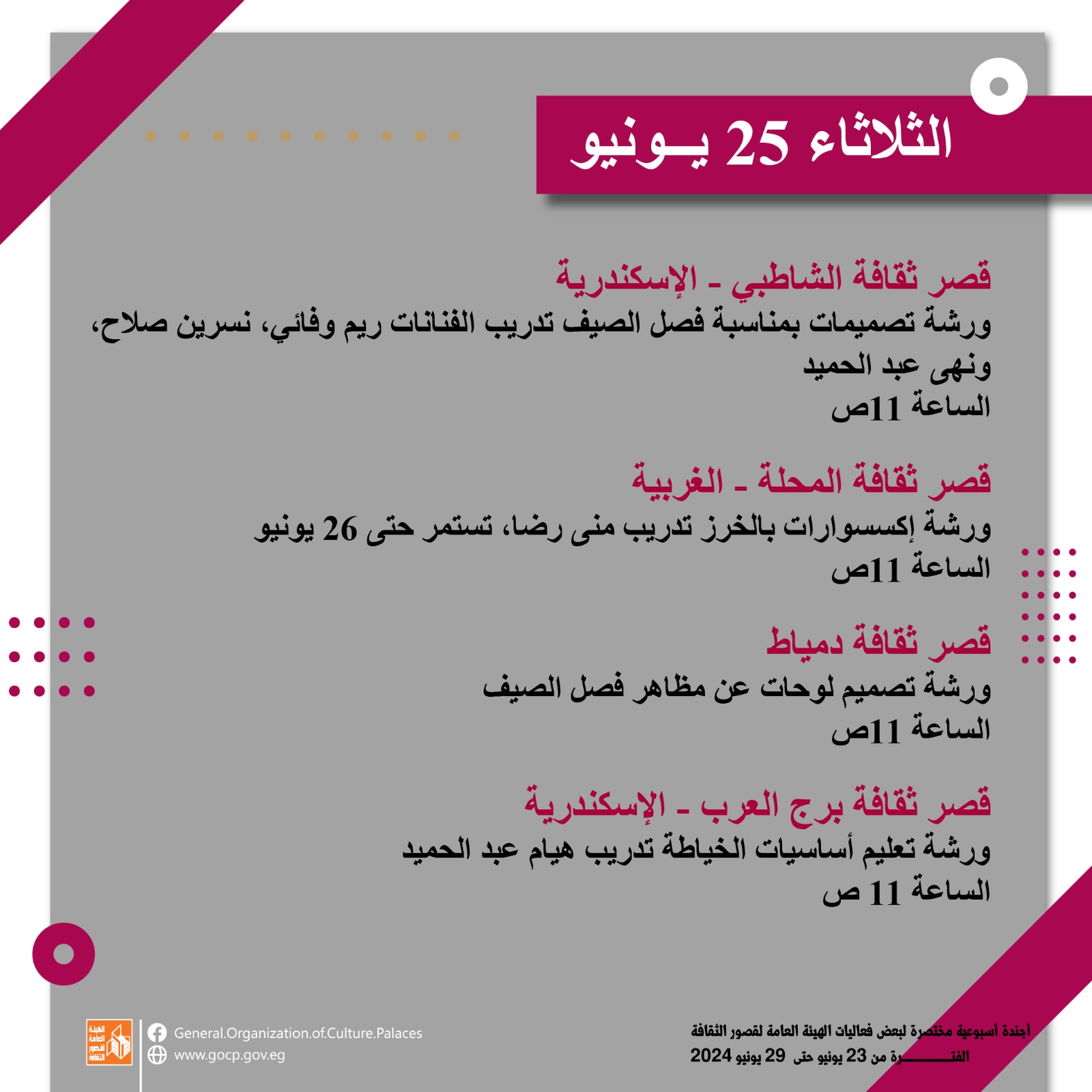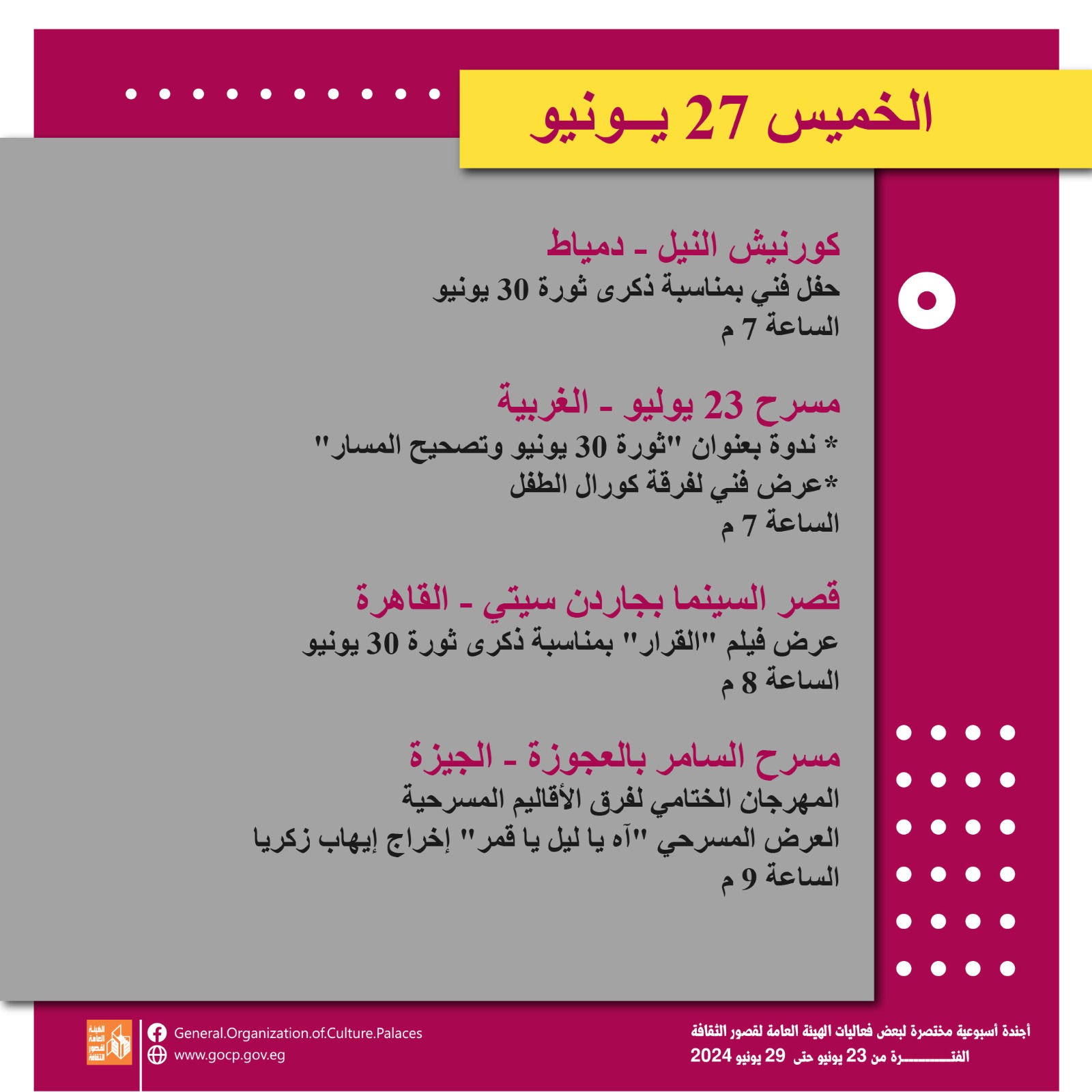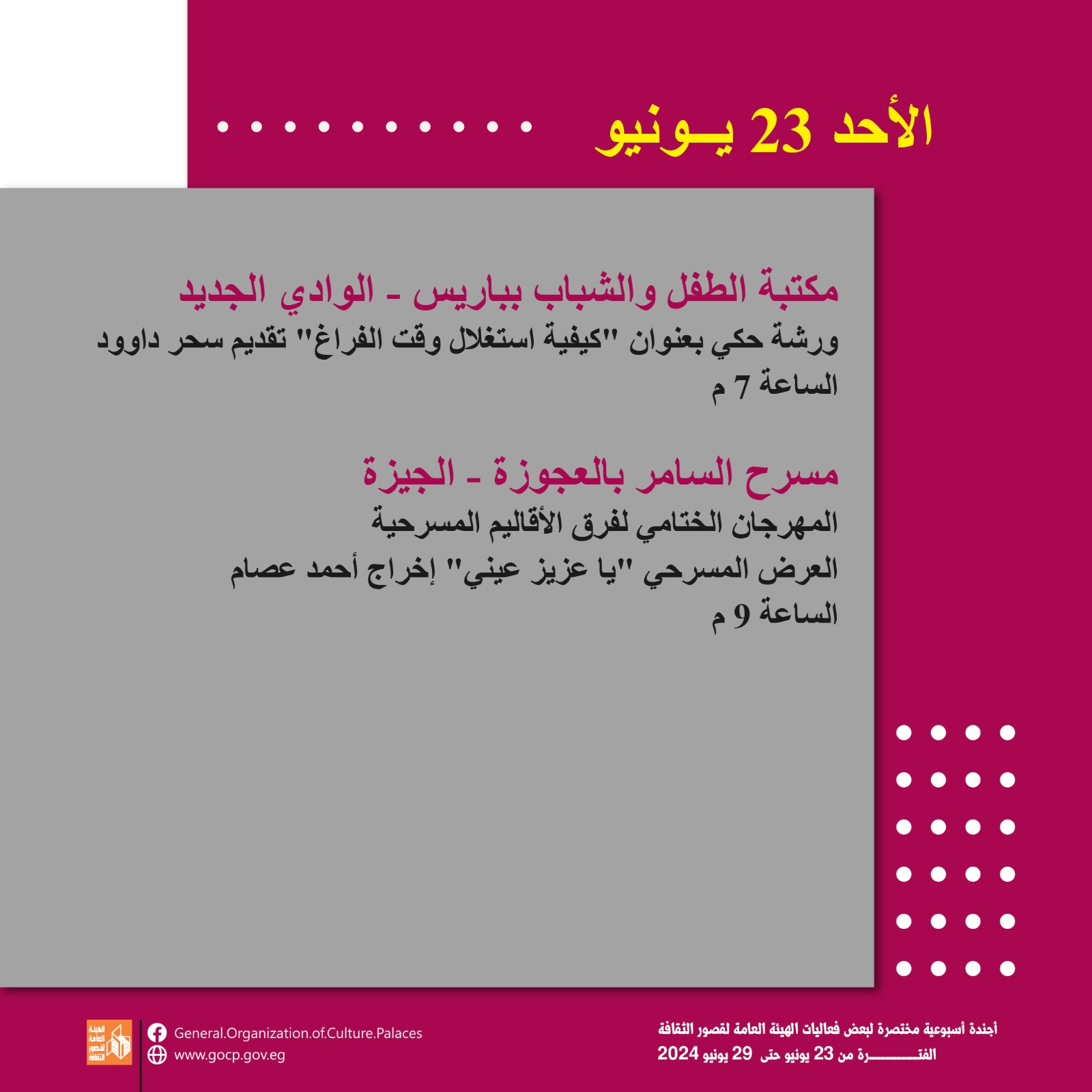 ضمن برامج وزارة الثقافة، وبرعاية الدكتورة نيفين الكيلاني، وزيرة الثقافة، أعدت الهيئة العامة لقصور الثقافة، برئاسة عمرو البسيوني، أجندة حافلة هذا الأسبوع تتضمن مجموعة متنوعة ومتميزة من الفعاليات الثقافية والفنية، بدءا من اليوم الأحد وحتى السبت المقبل 29 يونيو.