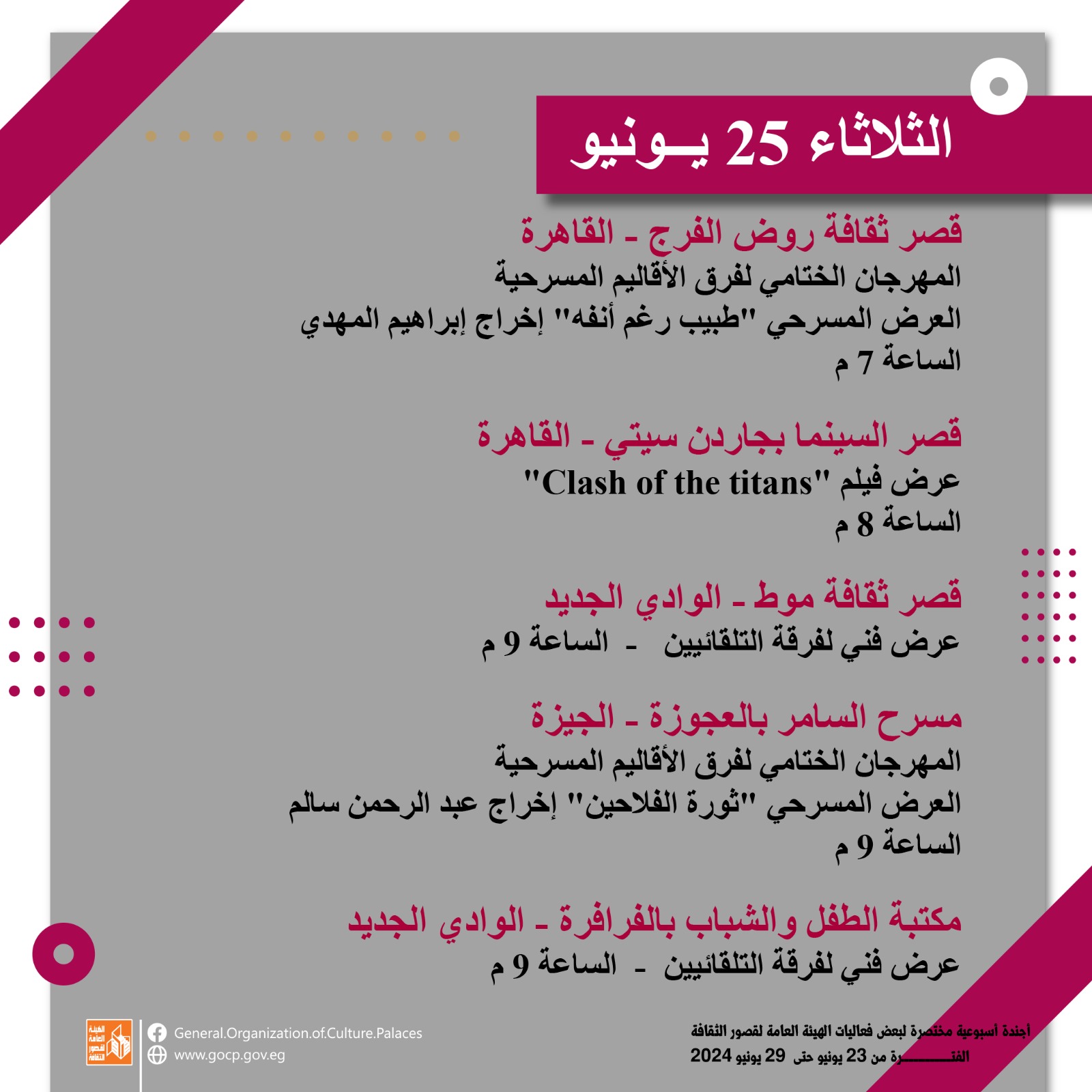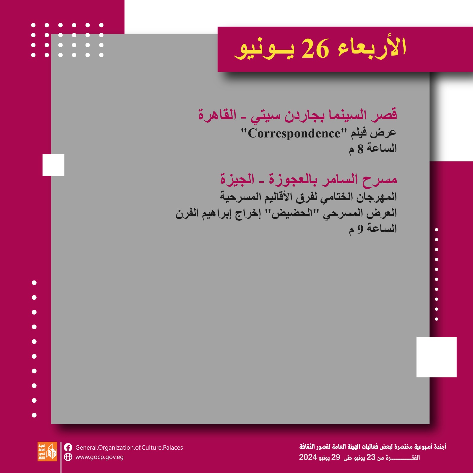 كما تواصل قصور الثقافة تقديم عروض المهرجان الختامي لفرق الأقاليم المسرحية في دورته السادسة والأربعين، والذي يشارك به 26 فرقة مسرحية تمثل جميع الأقاليم الثقافية، حتى يوم 29 من الشهر الحالي الذي يشهد حفل ختام المهرجان بالسامر.
