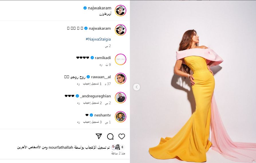 وتألقت نجوى كرم بلمسات ناعمة وجاذبة من عالم موضة 2024، حيث ارتدت فستان طويل مجسم، ينتمي لقصة الكورسية مع الأوف شولدر، صمم من قماش الكريب الناعم باللون الأصفر الفاتح مع البينك الرومانسي الحالم لتمزج بكل سحر بين النقاء والنعومة على خطى عارضات الأزياء.