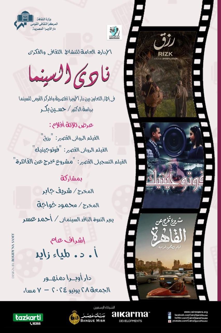 تواصل دار الأوبرا  المصرية، برئاسة الدكتورة لمياء زايد، ضمن نشاطها الثقافى والفكرى فعاليات نادى السينما بالتعاون مع المركز القومي للسينما برئاسة الدكتور حسين بكر وتعرض فيلمين روائيين قصيرين هما : "رزق وفوتوجينيك ،وآخر تسجيلي قصير بعنوان مشروع تخرج عن القاهرة، وذلك في السابعة مساء الجمعة ٢٨ يونيو على مسرح أوبرا دمنهور.