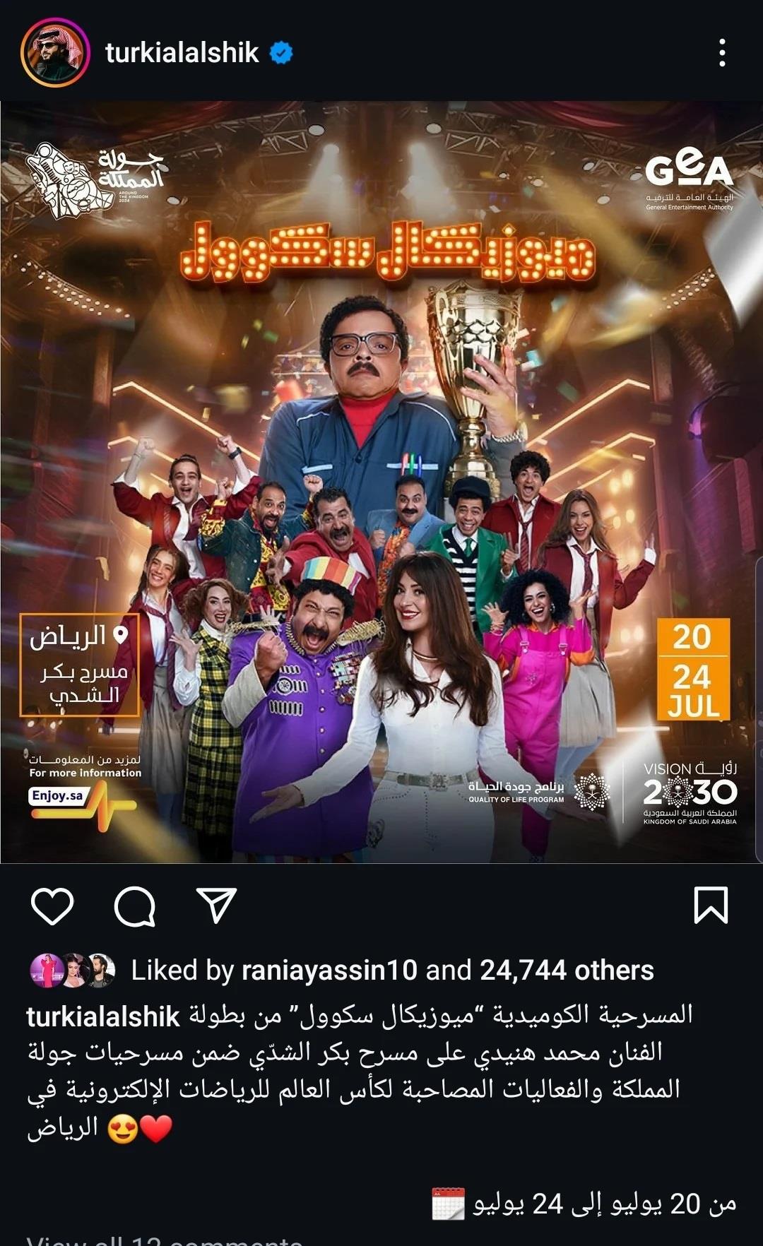 ونشر تركي آل شيخ البوستر الدعائي للمسرحية عبر حسابه الرسمي على موقع تبادل الصور والفيديوهات "إنستجرام"، معلقًا: "المسرحية الكوميدية ميوزيكال سكول من بطولة الفنان محمد هنيدي على مسرح بكر الشدي ضمن مسرحيات جولة المملكة والفعاليات المصاحبة لكأس العالم للرياضات الإلكترونية في الرياض .. من 20 يوليو إلى 24 يوليو".