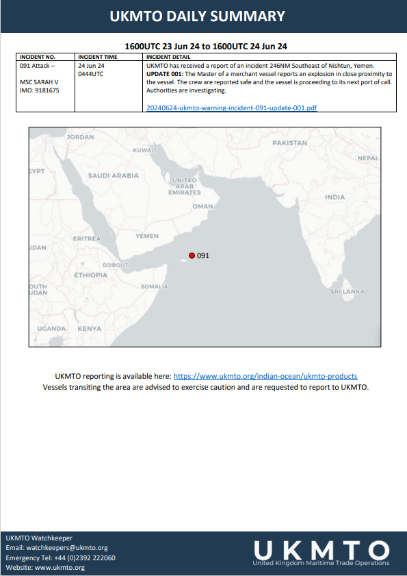 وظهر في الفيديو زورق يمني يطارد السفينة ثم تنفجر السفينة بعد ثوانيٍ من المطاردة، ويبدوا أن الزوق اصطدم بالسفينة.