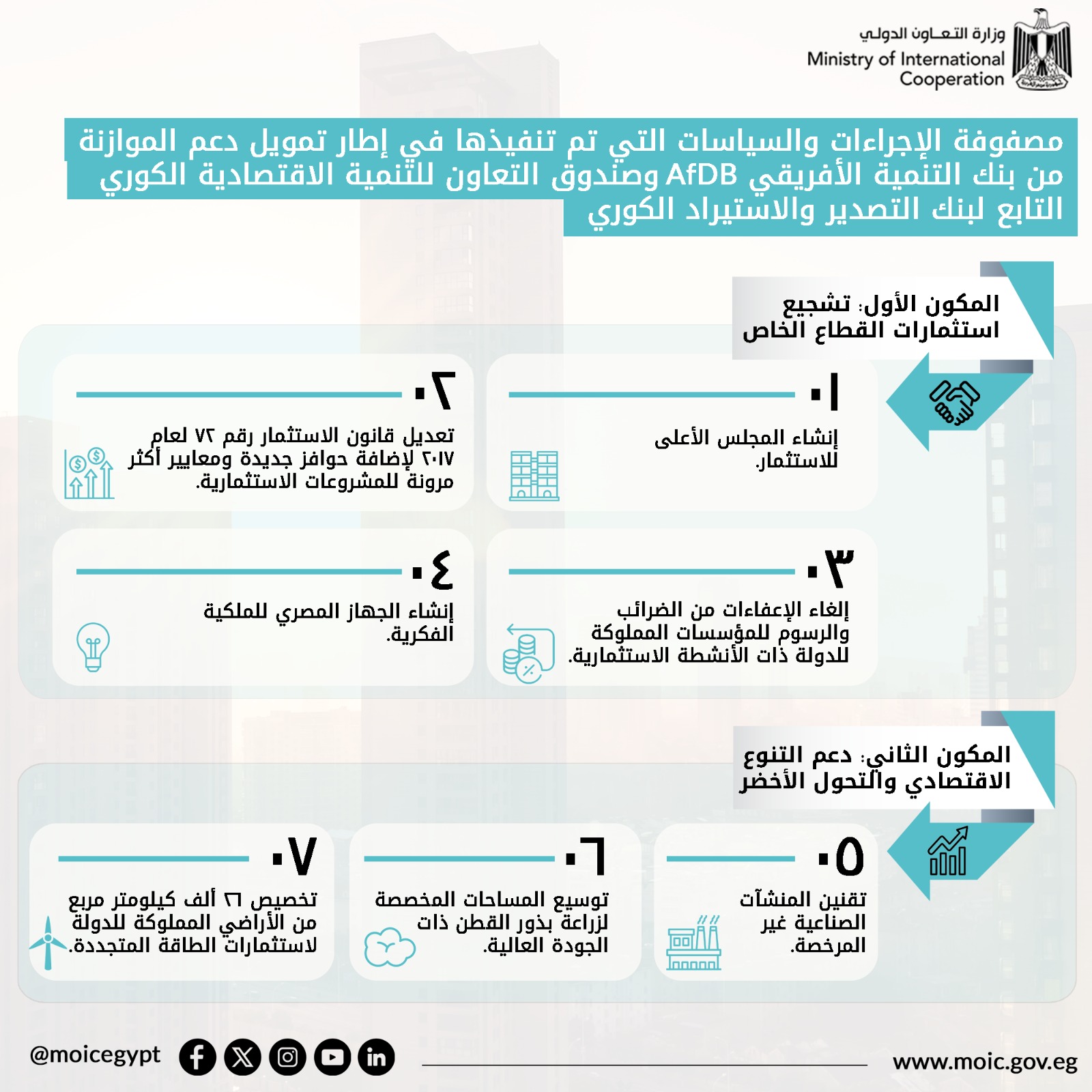 بينما عملت الحكومة على تنفيذ عدد من الإصلاحات في إطار التمويل الذي تم توقيعه مع بنك التنمية الأفريقي بقيمة 131 مليون دولار، إلى جانب تمويل صندوق التعاون الاقتصادي للتنمية الكوري EDCF بقيمة 100 مليون دولار، وذلك تحت مظلة محورين رئيسيين هما تشجيع استثمارات القطاع الخاص، ودعم التنوع الاقتصادي.