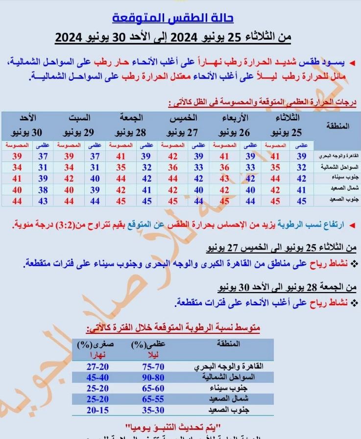 حالة الطقس.. أعلنت الهيئة العامة لـ الأرصاد الجوية ، عن درجات الحرارة اليوم الثلاثاء 25 يونيو 2024، موضحة أن الطقس سيكون شديد الحرارة نهارًا على أغلب الأنحاء وحارًا على السواحل الشمالية، فيما تصل درجات الحرارة المحسوسة إلى 45 درجة.