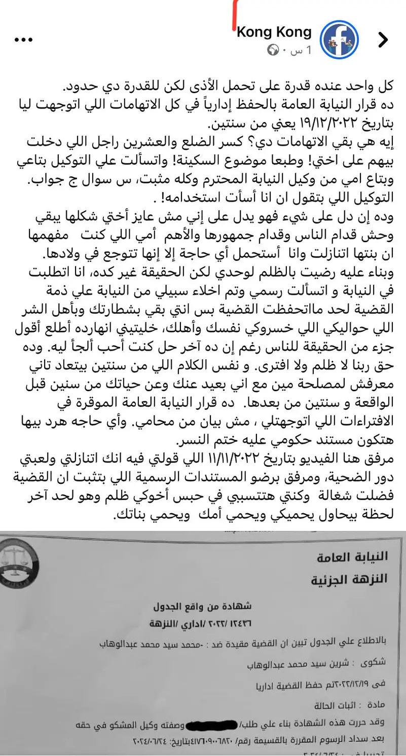 وتابع: "نفس الكلام اللي من سنتين بيتعاد تاني معرفش لمصلحة مين مع اني بعيد عنك وعن حياتك من سنين قبل الواقعة وسنتين من بعدها ده قرار النيابة العامة الموقرة في الافتراءات اللي اتوجهتلي، مش بيان من محامي. وأي حاجه هرد بيها هتكون مستند حكومي عليه ختم النسر، مرفق هنا الفيديو بتاريخ 11/11/2022 اللي قولتي فيه انك اتنازلتي ولعبتي دور الضحية".